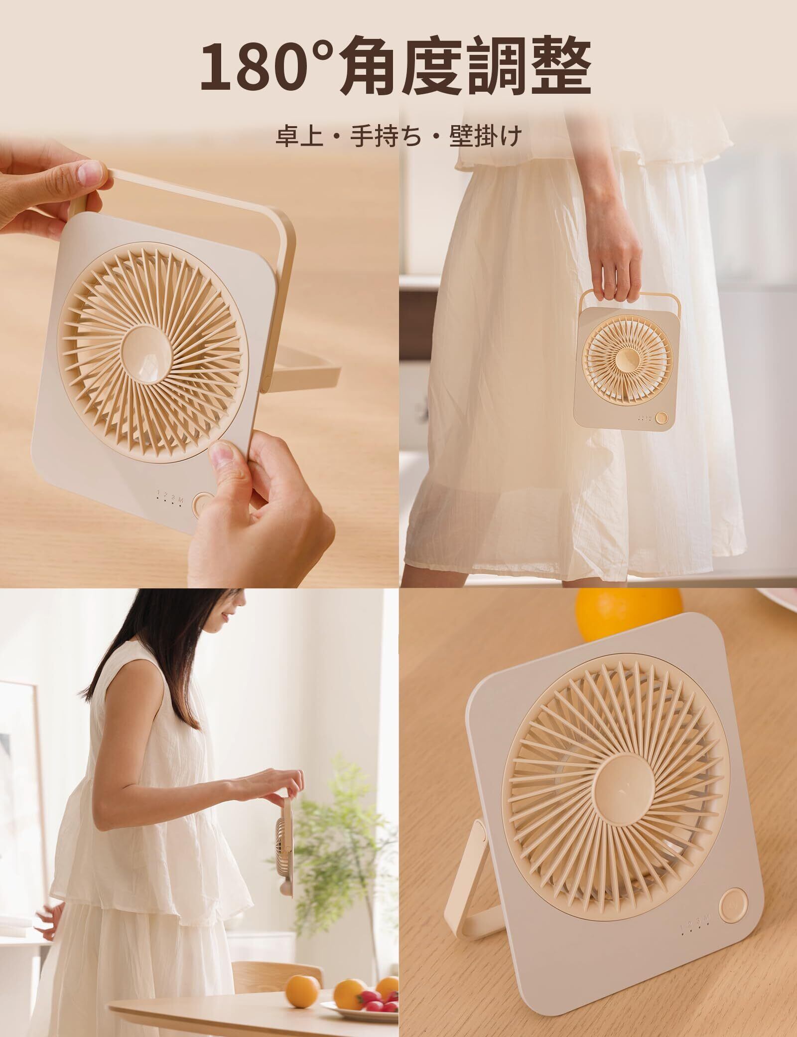 【折りたたみ・180°調節スタンド】様々な声を活かした電動ファンには180度回転できるスタンドがあり、各角度に調整して素早く冷却できます。「0°:手持ち扇風機」、「10~140°:卓上扇風機」「180°:壁掛け扇風機」一台三用です。