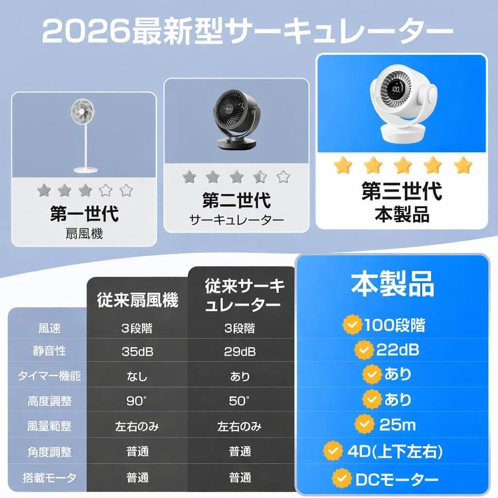 【100段階風量調整|卓上扇風機としても最適】100段階の風量調整が可能な高機能サーキュレーター。デスクに置いて使える卓上扇風機としても快適です。コンパクトながらパワフルな送風を実現し、空気循環用のサーキュレーターとしても十分な風量を確保しています。