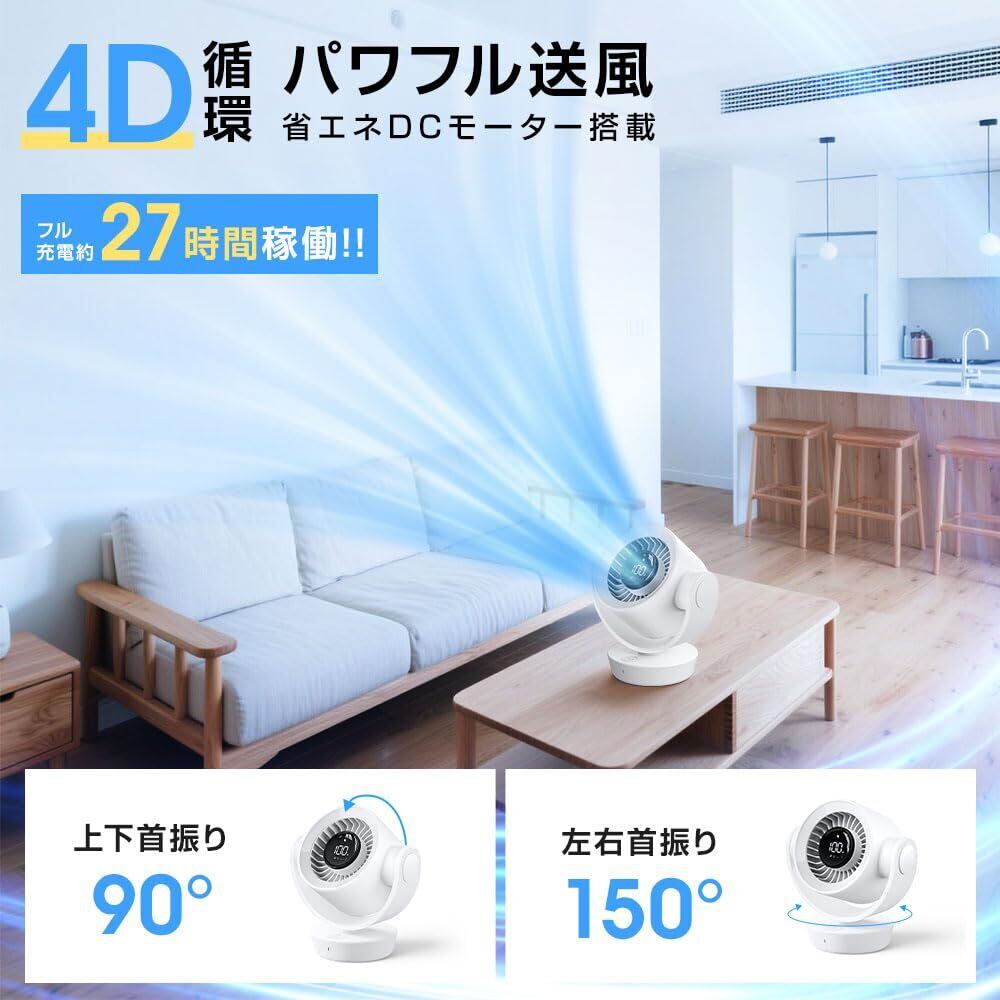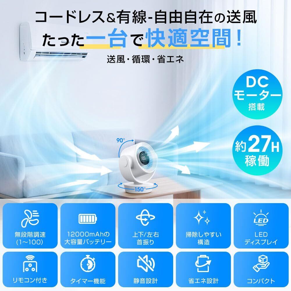サーキュレーター 扇風機 小型 卓上扇風機 充電式 コードレス 100段階調節 大風量 強力 静音 27H長時間稼働 節電 省エネ Type-C 急速充電 上下左右 自動首振り リモコン付き 洗える 10Hタイマー機能付き タッチパネル搭載 自動消灯 持ち運び せんぷうき パワフル送風機 寝室 掃除 洗濯物乾燥 部屋干し 梅雨 除湿 兼用