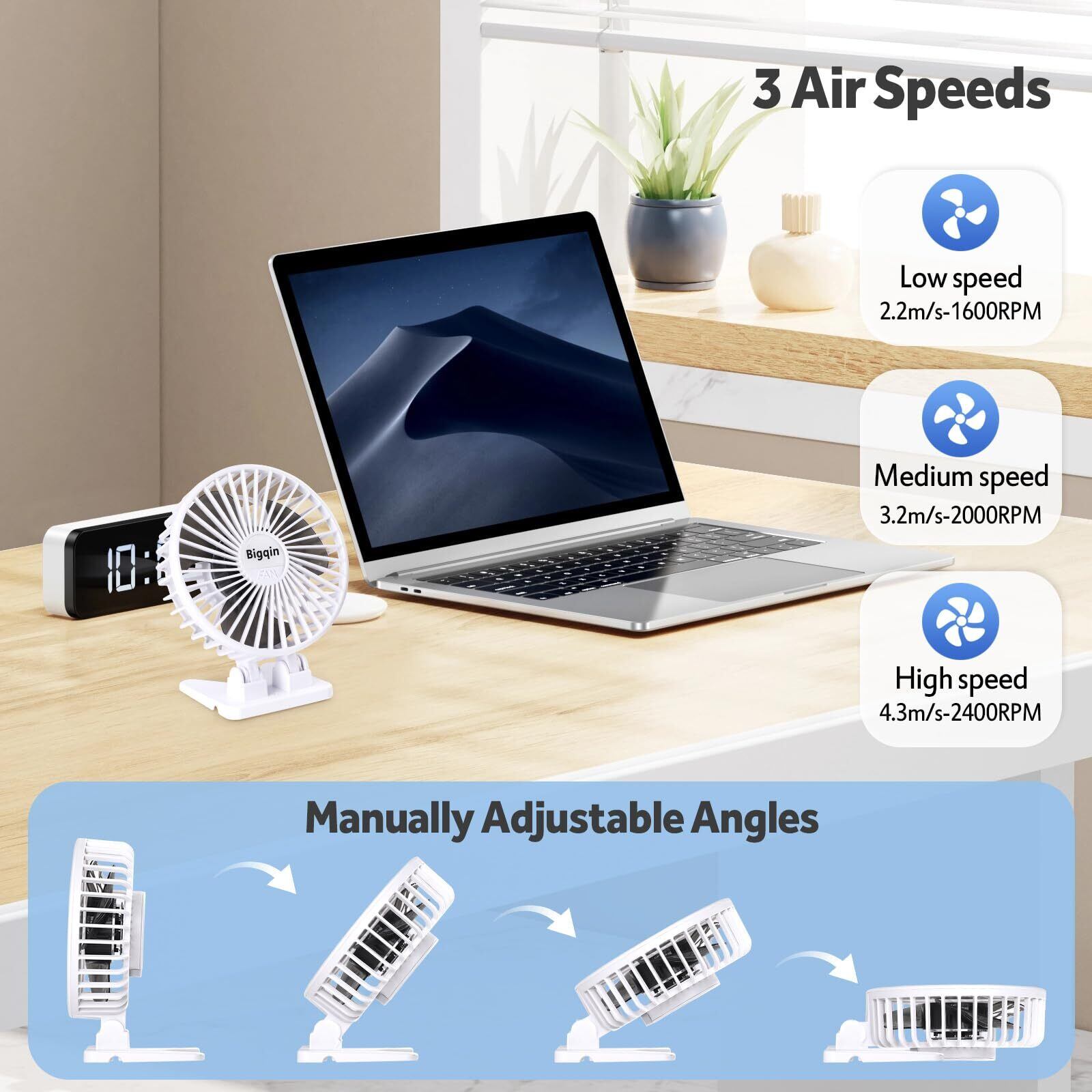 【風量3段階&角度調整可】スイッチ1つで風量は微風から強風まで3段階調整ができ、強力な風と優しい風を気温に合わせて調節できます。また、上下風向調整が可能で、全方位の角度から気持ち良い涼しい風が吹きます。