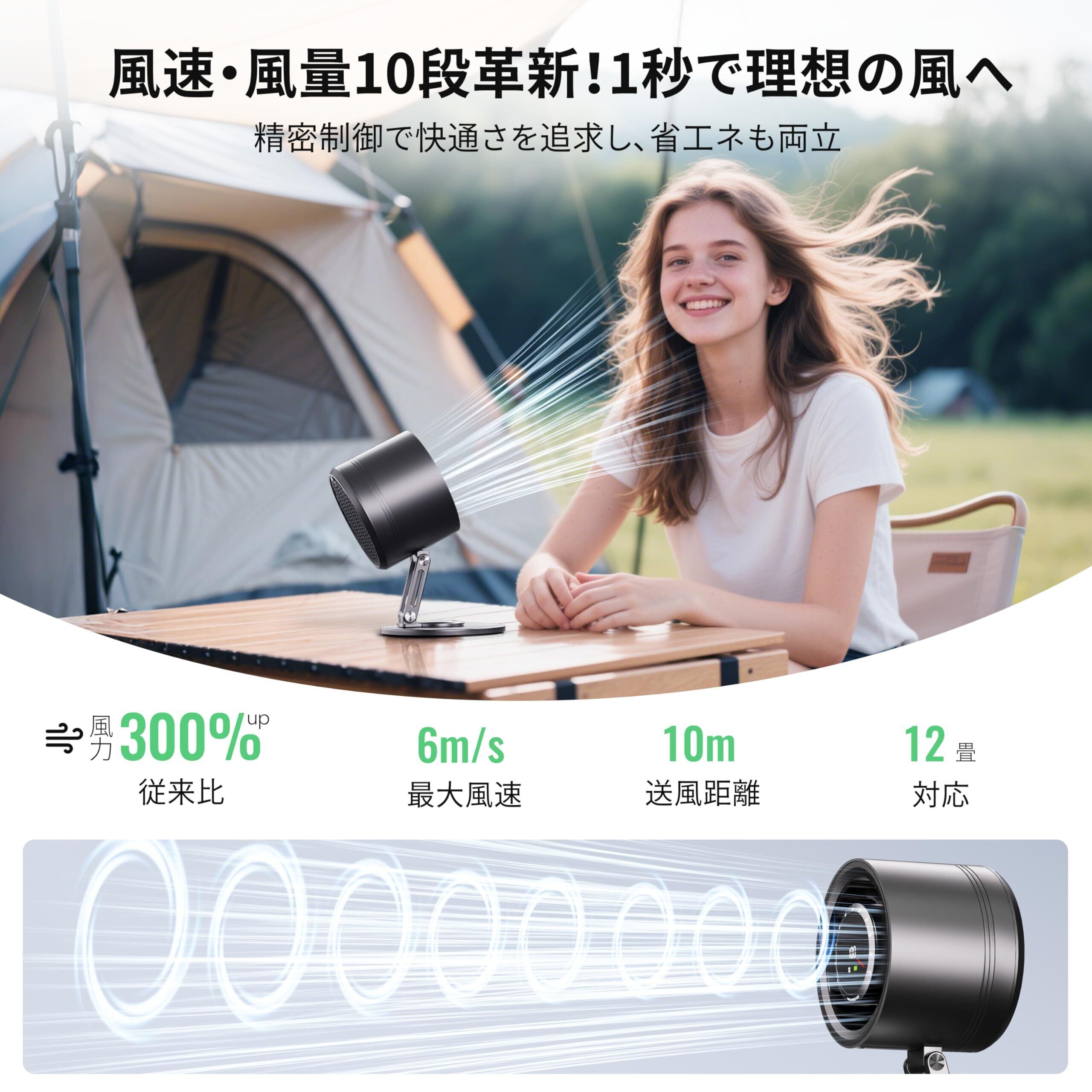 【独自開発の風路構造で最大12畳の空間に対応】デュアルカット風路と高速風筒による独自の構造。内部には7枚の螺旋状羽根を搭載し、高圧タービン風路システムと組み合わせることで、風の流れを強力に加速させます。同クラスの小型プラスチック製サーキュレーターと比較して、風がより集中し、遠くまで届くのが特徴です。最大風速距離は10メートルに達し、パワフルで安定した直線的な風を生み出し、空気の循環と換気を促進し、部屋の温度を均一で快適に保ちます。12畳の広い空間でも、力強い送風と効率的な空気循環を実現し、風力効率は一般的な扇風機の 2 倍以上です。