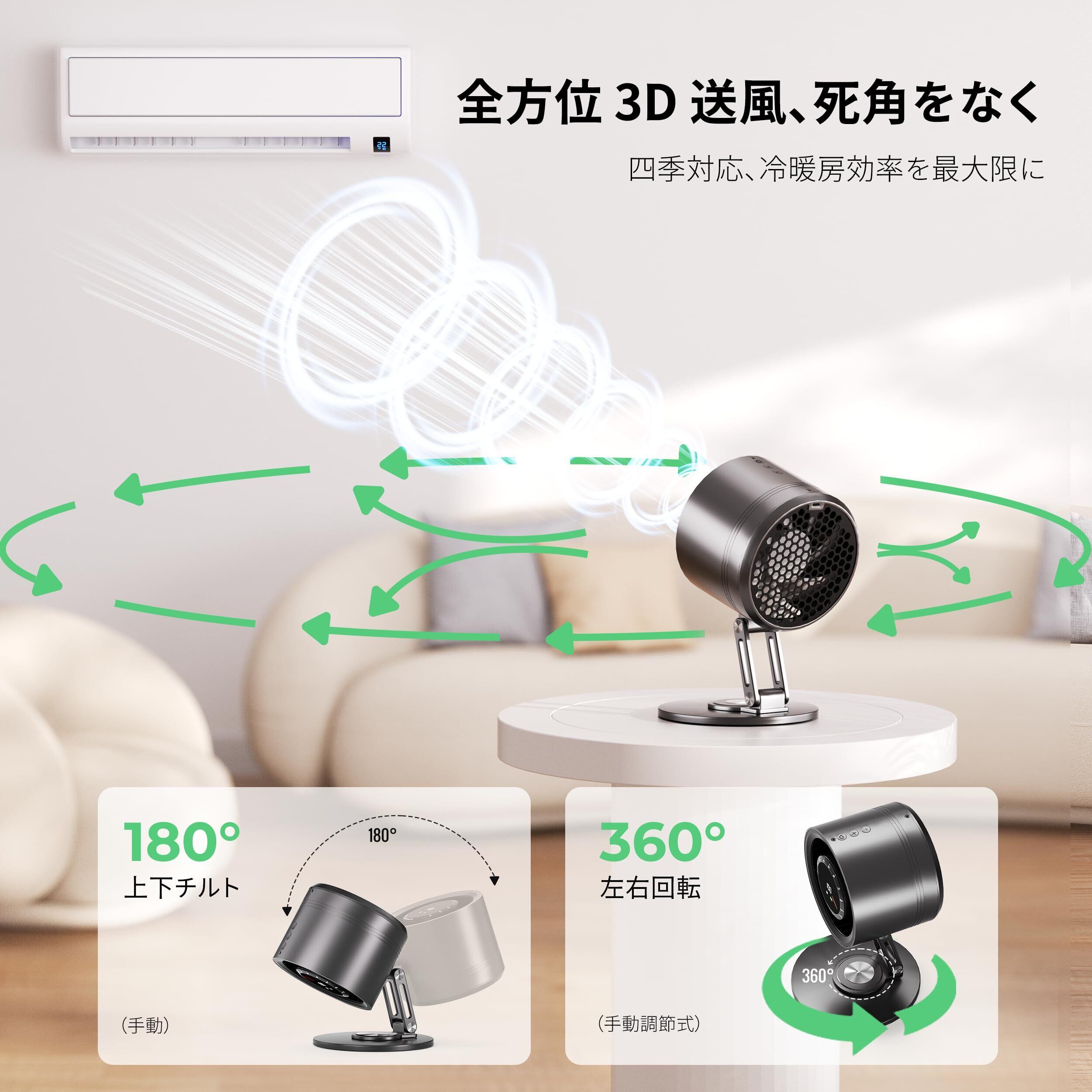 【最先端!360°×180° 立体送風で、部屋の隅々まで快適に】中のダブルスイングアーム構造を採用。左右 360°(手動)、上下 180° の全方位送風が可能です。天井や床に向けて送風することで、冷暖房の効率を大幅に向上させ、電気代を節約し、部屋の温度ムラを解消します。折りたたむと体積が 50%減少!高さもわずか 17cm になるため、収納に困りません。一人暮らしの狭い空間にもスッキリ収まります。