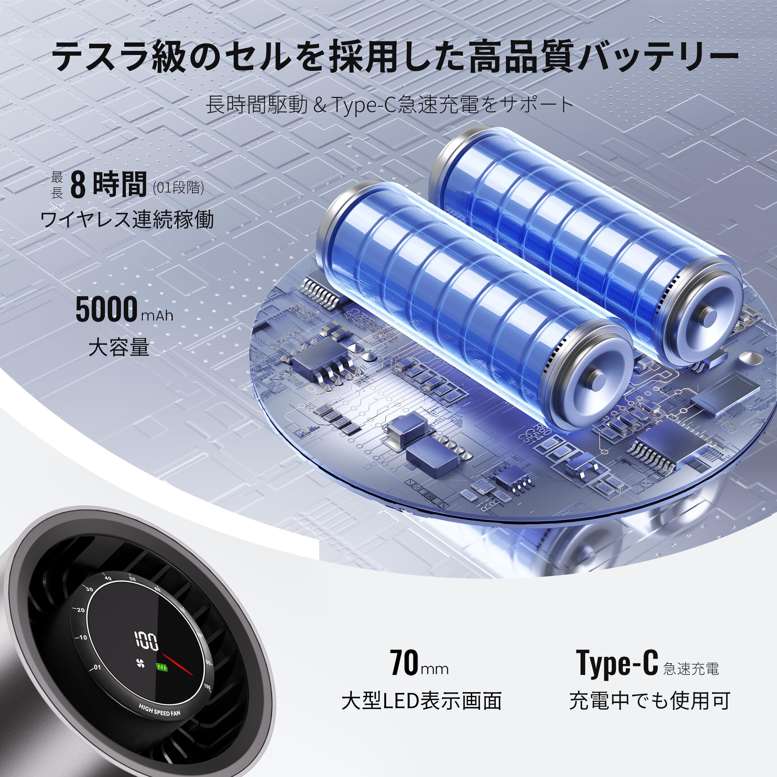 【5000mAhバッテリーで最長8時間のワイヤレス稼働】テスラ級のセルを採用した高性能バッテリーを搭載。5000mAhの容量は通常のデスクトップファンの2.5倍以上で、バッテリー持続時間が大幅に向上しています。最強モード(10 段階)では2.5時間、ECO 省エネモード(01段階)では最長8時間の連続使用が可能で、一日中の長時間使用にも対応します。従来の卓上扇風機の1A充電速度と比べ、この機種は5V-2Aの高速充電に対応しており、充電時間はわずか3.5時間で、ECOモードで一日中使えます。頻繁な充電が不要で、あなたの夏を涼しく快適に過ごせます。さらに、USB Type-C 接続による充電中でも使用可能な機能を備えており、室内や屋外を問わず、多様なシーンで柔軟にご利用いただけます。