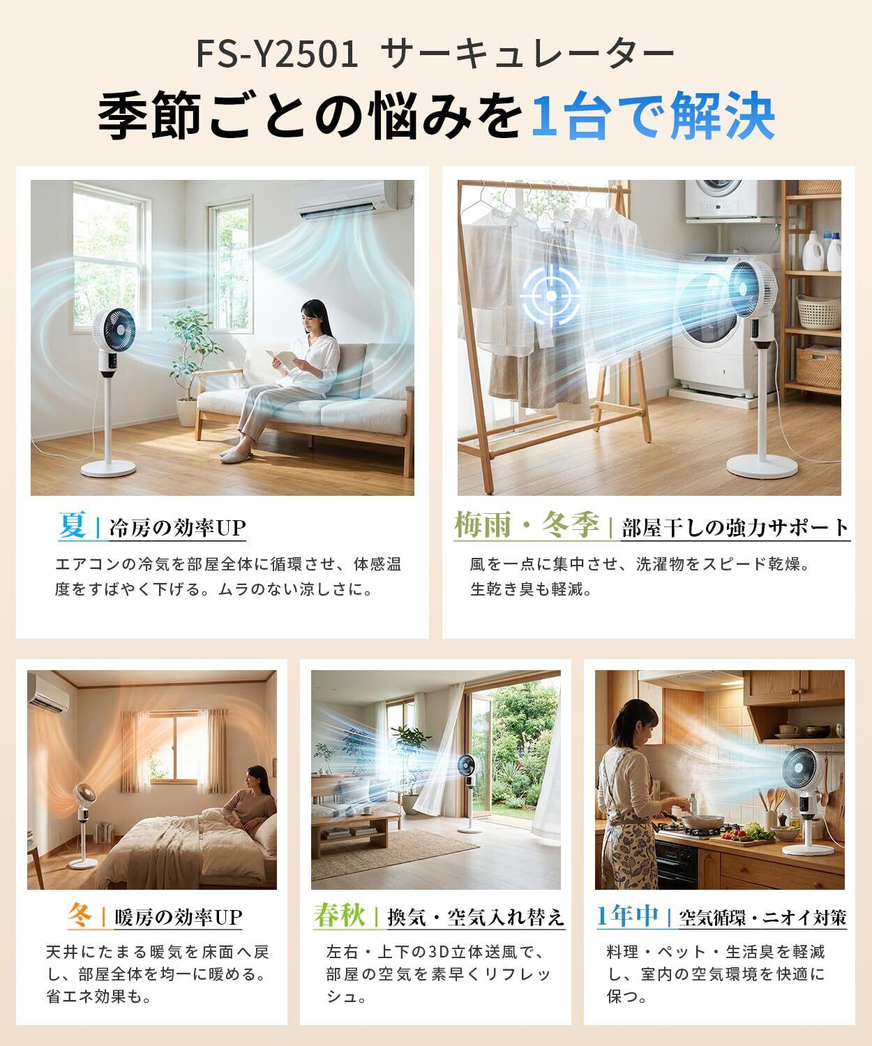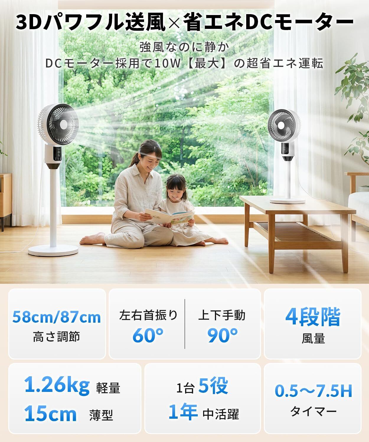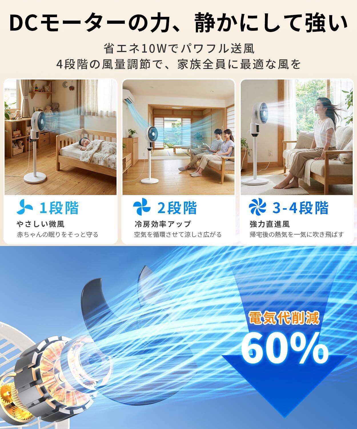 【4 段階風量&省エネ DC モーターで、静かさとパワーを両立】高性能な DC モーターを搭載し、4 段階で風量を細かく調節可能です。0.5-7.5Hのタイマー機能を搭載し、就寝時も安心してお使いいただけます。1 段階(弱)は図書館並みのわずか 25dB の静音設計で、お子様やご年配の方がいるご家庭でも快適にお使いいただけます。4 段階(強)ならパワフルな風を 12 メートル先まで届け、最大 20 畳の空間の空気循環を効率的に行います。従来の AC モーターと比較して約 60% の省エネを実現。実測値では、強モードで 24 時間連続運転しても消費電力はわずか約 1.08kWh。