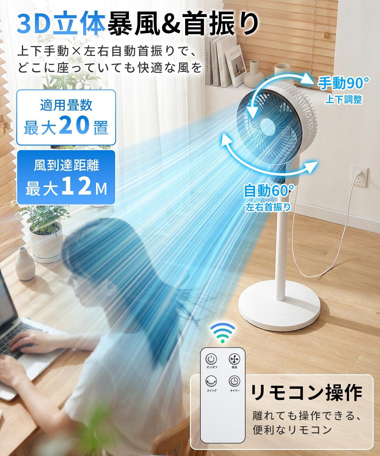 BOTSIONE サーキュレーター 静音 DCモーター 20畳 3D首振り 扇風機 省エネ 衣類乾燥 4段風量調節 2段階高さ調節 7.5Hタイマー リモコン付 薄型軽量 換気 オールシーズン対応 部屋干し 消臭 梅雨対策 新築祝い 父の日 ギフト ホワイト 取扱説明書