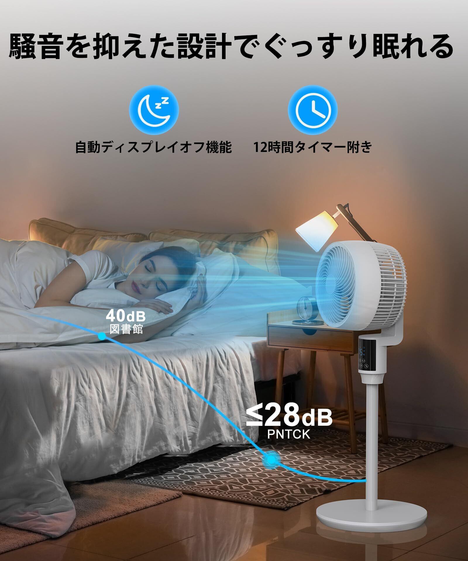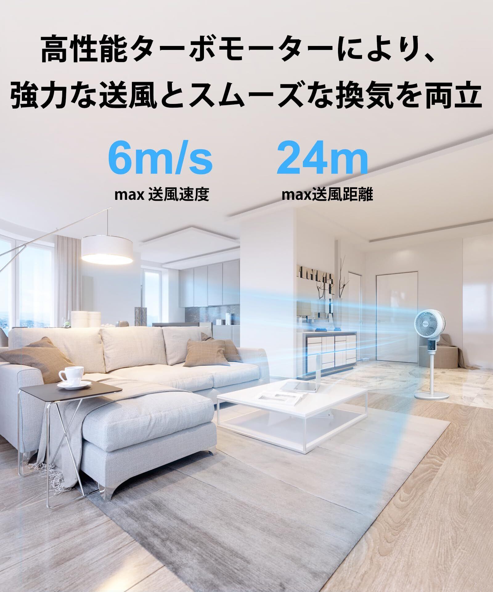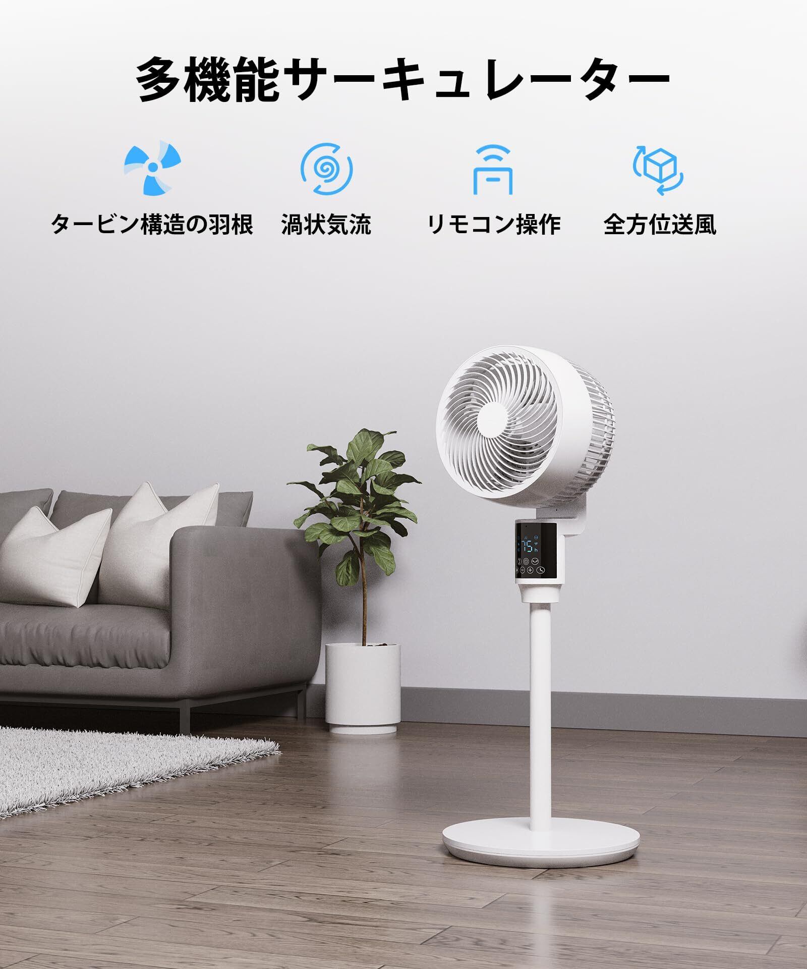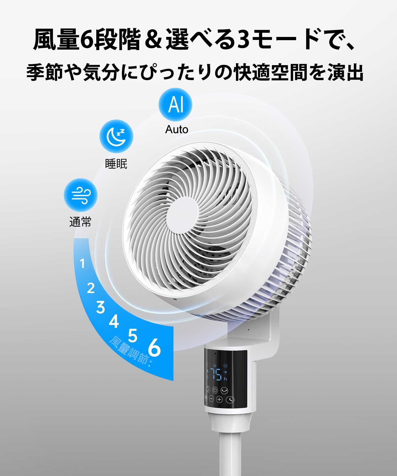 サーキュレーター 静音 扇風機上下左右360度首振り/AI風量自動調節/6段階風量/3モード/25dB/マイナスイオン機能/アロマ対応/最大24m送風/リモコン&タッチ操作対応/12時間タイマー付/節電/空気循環/部屋干し/梅雨対策/冷暖房効率化/PSE認証済