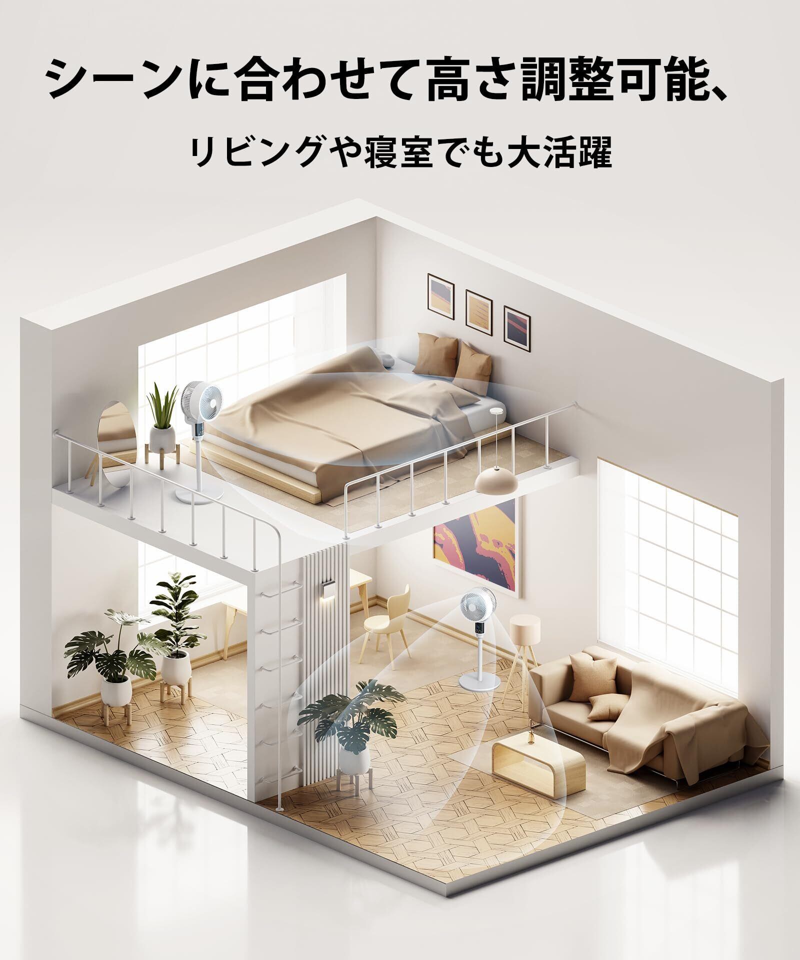 【上下左右首振り&3種類の送風モード&AI風量自動調節】商品到着後のご注意:=輸送の影響により、スライドバーが白いポールの中に入り込んでいる場合があります。ポールを軽く振って音がする場合、スライドバーが欠品しているわけではありません。白いポールのノブを取り外し、指でスライドバーを取り出した後、ノブを元に戻して取り付けてください。 上下80°、左右70°の首振り機能により、部屋の隅々までムラなく送風。部屋干しの洗濯物や空気の循環にも最適です。自然風・AIモード・おやすみモードの3種類の送風モードを搭載。AIモードでは、周囲の温度や環境に応じて風量を自動調整し、常に快適な空間を保ちます。