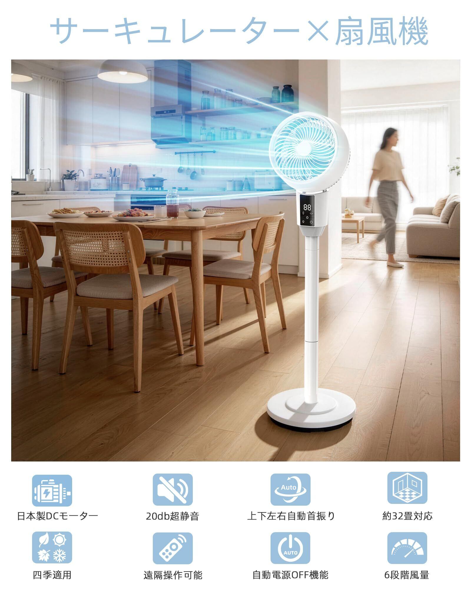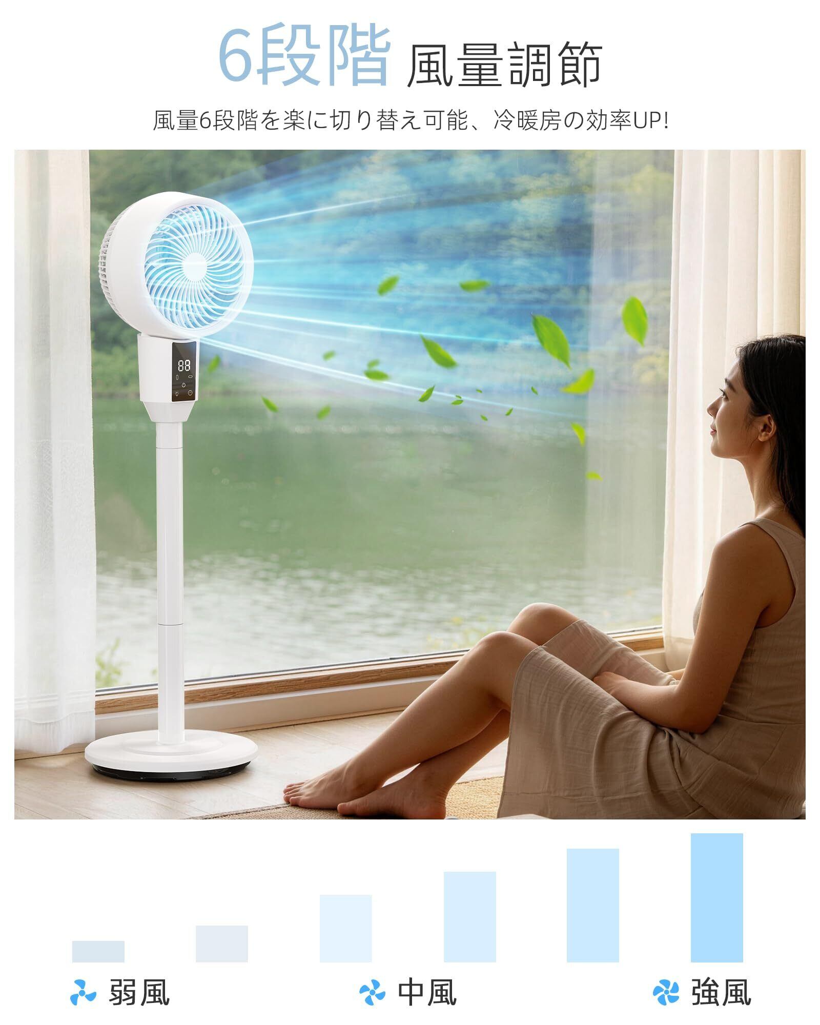 サーキュレーター 扇風機DCモーター搭載 360°自動首振り 6段階風量 リモコン付き 12Hタイマー 高さ3段階調整 ナイトライト 32畳対応 空気循環/部屋干し/梅雨除湿/冷暖房効率アップ リビング 卓上せんぷうき さーきゆれーた 日本語説明書付 PSE認証済