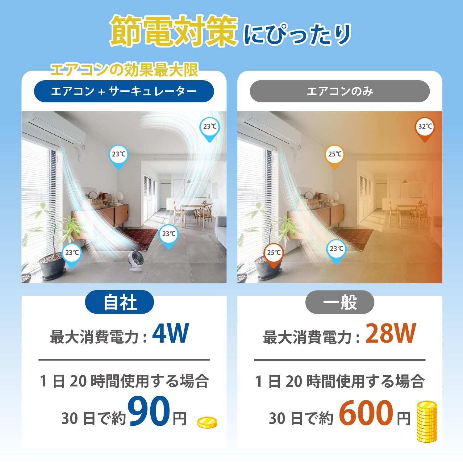 【究極の省エネモデル】LNEMサーキュレーターの最大消費電力は4W,静モードはなんと2Wとなり、人気サーキュレーターメーカーのなんと1/10。他社の28Wのサーキュレーターを1日20時間付けると、毎月660円ぐらいの電気代が発生しますが、のサーキュレーターなら約100円しか発生しません。 一人暮らしやエアコンを効率的に使いたい人に最適(ご注意:実際の電気代は、外の気温、エアコンの出力使用スペースの広さ、電力会社の料金などの要因によって異なる場合があります。)