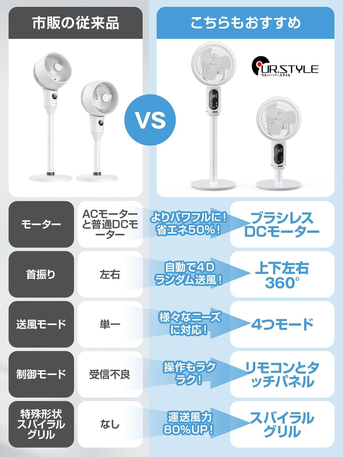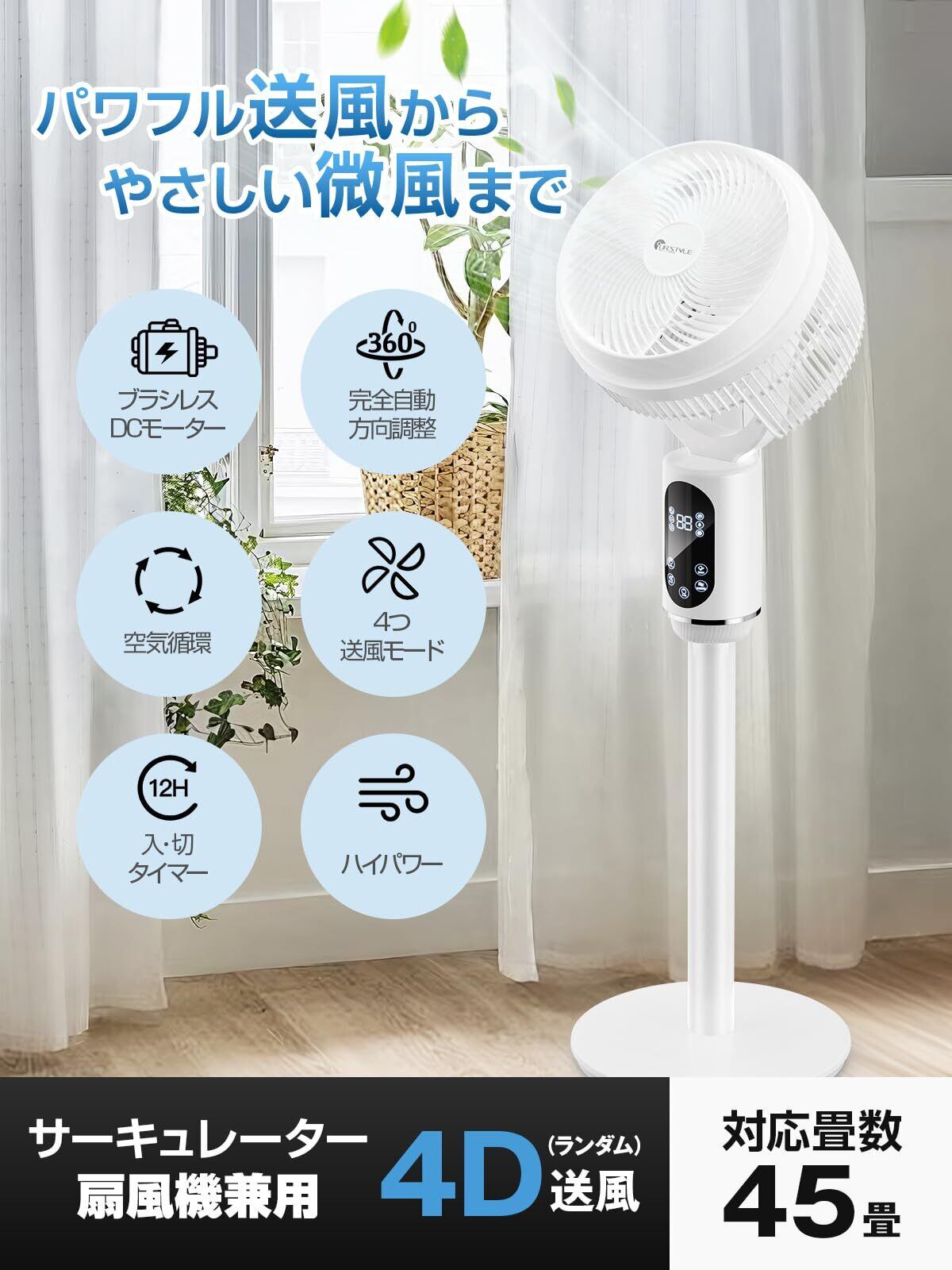 特徴 12時間タイマー機能、4種類送風モード、3段階風量調節, 360°全自動首振り、dcモーター採用、リモコン/タッチパネル両方操作