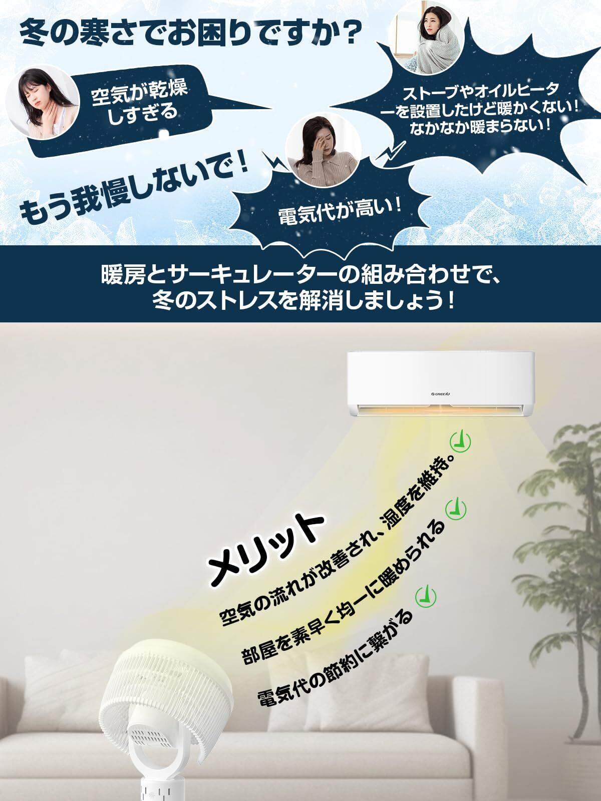 【2026年最新モデル登場!エアコンの最強パートナー&省エネ新基準】 この革新的なサーキュレーターは、冬の快適な暖房環境と効率的な省エネを両立させ、温もりに満ちた日常を支える新たな必需品です。エアコンや暖房機器との併用により、温かい空気を素早く室内全体に行き渡らせ、均一でムラのない室温を維持。暖房の消費電力を最大約50%削減し、光熱費を大幅に節約できます。地球環境と家計に優しいエコライフを、この一台から始めましょう。さらに、柔らかく自然な風が直接体に当たらない設計のため、健康に配慮したい方や小さなお子様、ご高齢の方も安心してご利用いただけます。リビングから寝室まで、あらゆる生活空間を隅々まで温もりで包み込むサーキュレーター。寒い季節をスマートに快適に過ごす最高の相棒として、ぜひお試しください。
