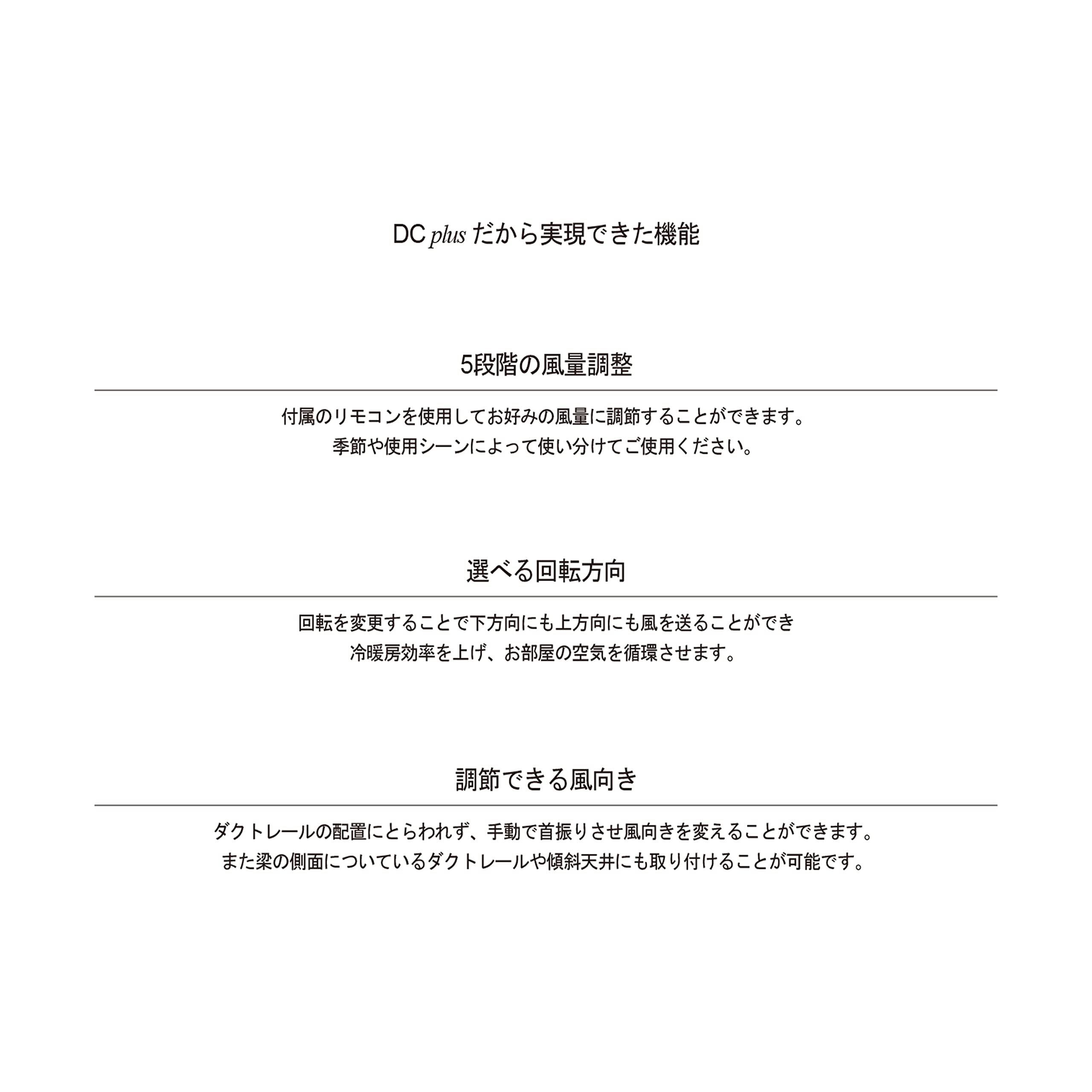 運転音 風量:1 13dB~風量:5 28dB Made in China ※天井直付けダクトレールではない場合、リモコンが反応しにくい場合がございます。 ※本製品はモーターが内蔵されているため、モーター特有の音が発生します。 ※簡易リモコンに関して:スマートな形のプロダクトな為、本体にON/OFFスイッチの搭載がございません。簡易リモコンでのON/OFFは、本体受光部に近づいての操作をお願いします。 ※調光機能付きの壁スイッチでの使用は出来ません。 ※羽根を取り付けの際は、羽根を留めているネジがしっかりと固定されている事を確認してください。