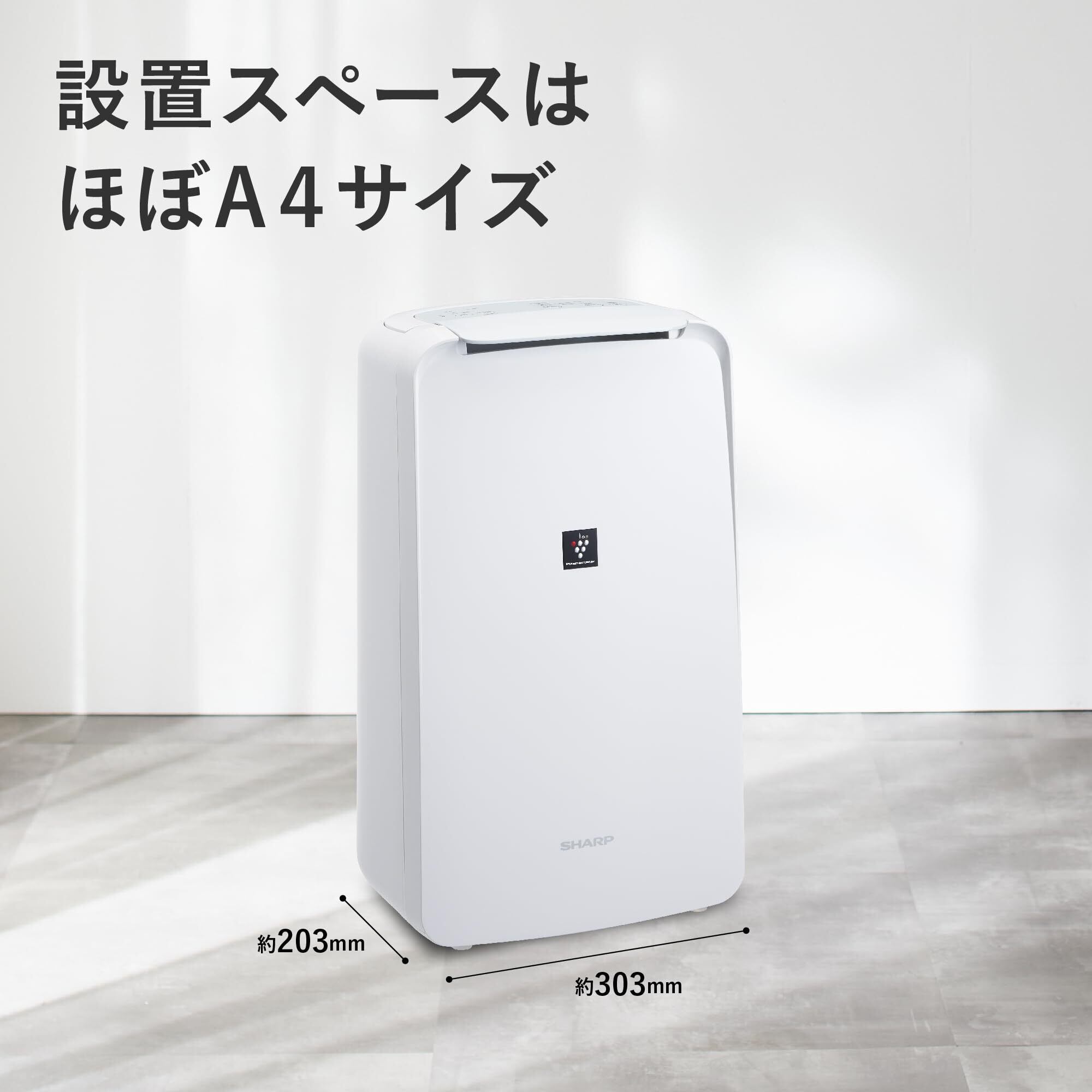 狭いスペースでの部屋干しに。省エネ除湿&コンパクトサイズ。【梅雨・夏に強いコンプレッサー方式】ヒーターを使用しないので暑い季節に高い能力を発揮。スピーディーに衣類を乾燥させます。【コンプレッサー方式の運転メカニズム】室内の湿った空気を冷却器で冷やし、結露させることで除湿。結露しやすい暑い季節に高い能力を発揮します。【省スペース】ほぼA4サイズの設置面積で狭いスペースでもお使いいただけます。プラズマクラスターで消臭&清潔。【プラズマクラスター除湿機の効果】気になる部屋干し臭の臭いを消臭。【プラズマクラスター7000搭載】シャープ独自の空気洗浄技術、プラズマクラスター7000を搭載しています。床まで届く下吹き送風。【バスマットに付着した菌の増殖を抑制】ルーバーを一番下向きにして頂くことで、脱衣所のマット、カーペットや床、窓ガラスの敷居など、ジメジメが気になる足元周りにもプラズマクラスターイオンと除湿された風が届きます。洗った靴を床に並べてそのまま乾かせる。使いやすさ。【24時間連続排水※1に対応】本体にホースをつなげば、連続排水が可能に。排水タンクに溜まった水を捨てに行く手間が省けたり、外出中などの長時間運転にも応えます。【ハンドル付で持ち運びラクラク】洗面所やクローゼットなどでの衣類乾燥や除湿・カビ対策・消臭に。軽量&コンパクトデザインだから、使いたい場所に手軽に持ち運べます。【使いやすさにこだわった充実機能】排水タンクは凹凸が少なくお手入れしやすい[ハンドル付きタンク]。ホコリブロックプレフィルターで大きなホコリを入り口でブロックする。内部乾燥機能で、本体の内部に残った水分を乾燥(衣類消臭「弱」運転を2時間切タイマー設定で運転して頂くことで内部を乾燥します。) *1<付着生乾き臭>●試験機関:当社調べ●試験方法:部屋干し衣類の生乾きのニオイ成分を付着させた試験片で消臭効果を6段階臭気強度表示法にて評価。■試験結果:約3時間で気にならないレベルまで消臭。CV-E71(プラズマクラスター7000搭載機種)のイオン送風「弱」運転で実施。※a※b *2<付着汗臭>●試験機関:当社調べ●試験方法:汗のニオイ成分を染み込ませた試験片で消臭効果を6段階臭気強度表示法にて評価。■試験結果:約6時間で気にならないレベルまで消臭。CV-E71(CV-R71と同等性能機種)のイオン送風「弱」運転で実施。 *3<付着菌>●試験依頼先:(一財)日本食品分析センター●試験成績書:第18148684001-0101号●試験方法:本体から約50cmの位置で、ある1種の菌を付着させた試験片(バスマット)に水を滴下後、CV-J71(プラズマクラスター7000搭載機種)のルーバー下向きで衣類乾燥「強」12時間運転と「運転停止」12時間を毎日繰り返し行い、機器なしと菌数を比較。■試験結果:3日後、機器ありでは菌の増殖を抑制することを確認。 ※1 市販のホース<内径15mm>が必要です。