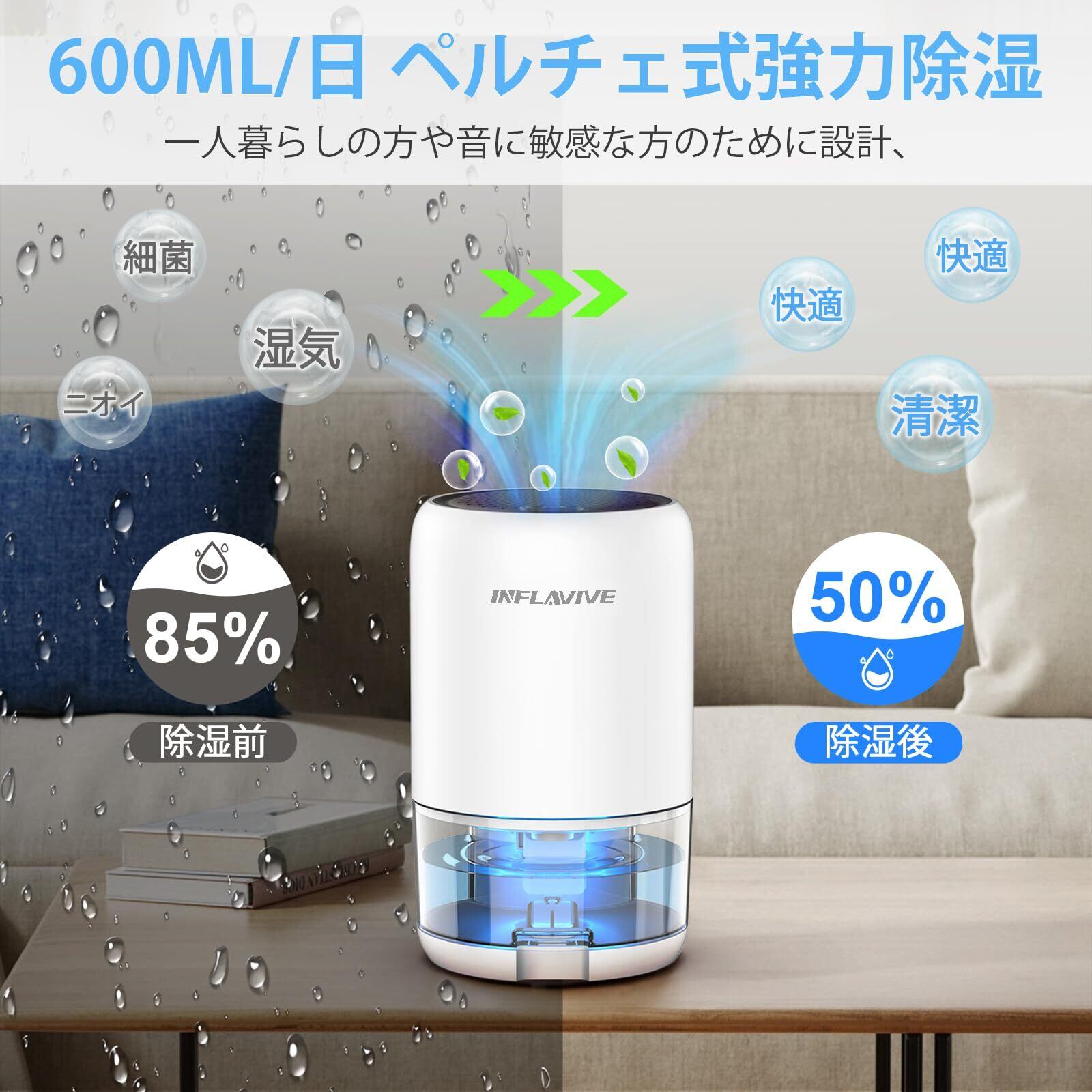【除湿·静音·狭所向け除湿機】コンパクトな半導体除湿機 、ペルチェ式としては強力な最大600ML/日(30℃, 80%RH)の除湿能力を搭載。ペルチェ素子によって湿気を冷やし結露させる除湿方式をペルチェ式除湿機です。強い除湿力を持ち、除湿とともに、湿気によるダニ・結露・異臭・カビなどを抑えられ、湿気による問題を効果的に防ぎ、快適で乾燥した空間を提供します!狭小空間の「湿気・カビ」を強力解決! 同時にこの除湿機 小型は静音除湿と省エネのお手伝い人でもある。梅雨の悩みをスッキリ解決。お休みモードを押すと運転音は30dB以下なので眠りを妨げずに寝室や子ども部屋でも安心してお使いいただけます。シンク下、キャンピングカー、クローゼット、下駄箱、脱衣所、トイレなど、湿気がこもりやすく大型機が置けない狭い場所の「死角」に最適です。ジメジメした梅雨時の湿気対策から、冬場の結露防止まで、中ピンポイントで活躍します。