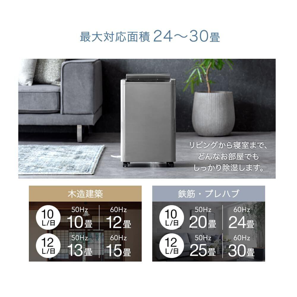 【詳細】■定格消費電力:158W(50Hz)/201W(60Hz) ■電気代(1時間あたり):約5.75円(50Hz)/約7.32円(60Hz) ■除湿方式:コンプレッサー式 ■最大除湿量:<環境温度30℃/湿度80%時>10L/日、12L/日 ■対応面積の目安:50Hz…木造13畳、鉄筋25畳 60Hz…木造15畳、鉄筋30畳 ■動作音:38dB以下 ■タンク容量:3L ■推奨使用環境:温度5~38℃、湿度30~90% ■風量:2段階 ■湿度設定:40%、50%、60%、70% ■運転モード:連続、おまかせ、衣類乾燥 ■タイマー:1~24時間(1時間刻み)