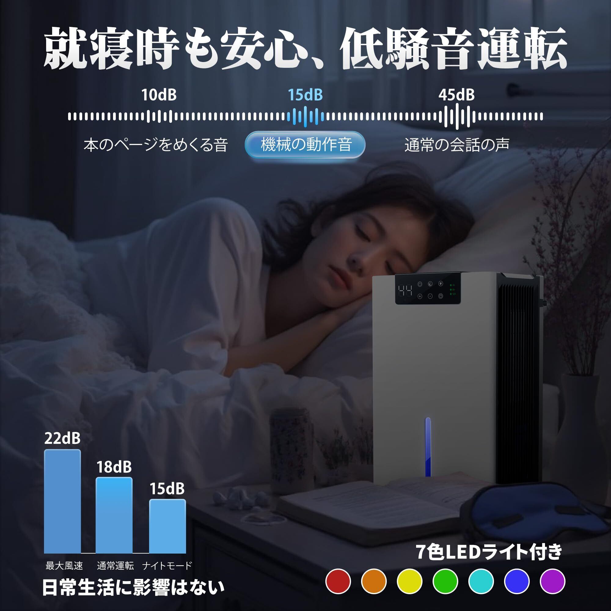 【静音設計の除湿機·7色変化するライト·安眠サポート】25dBの図書館レベルの静かさ(※日本騒音学会測定データによる)。夜間モード時は15dBまで低減可能で、就寝中の邪魔になりません。7色変化するムードライト機能付き、タッチパネル式LEDディスプレイで、現在湿度を数値表示できます。