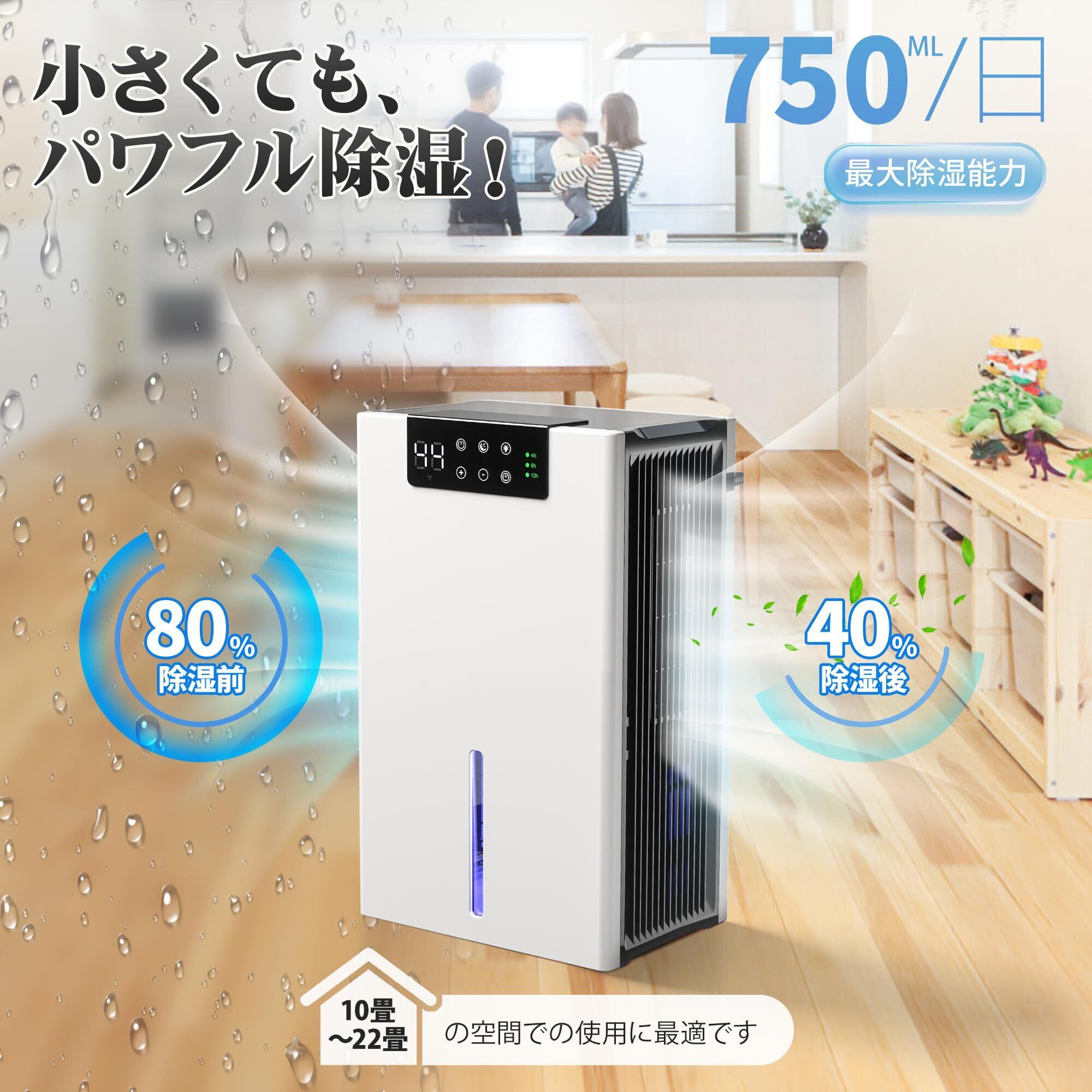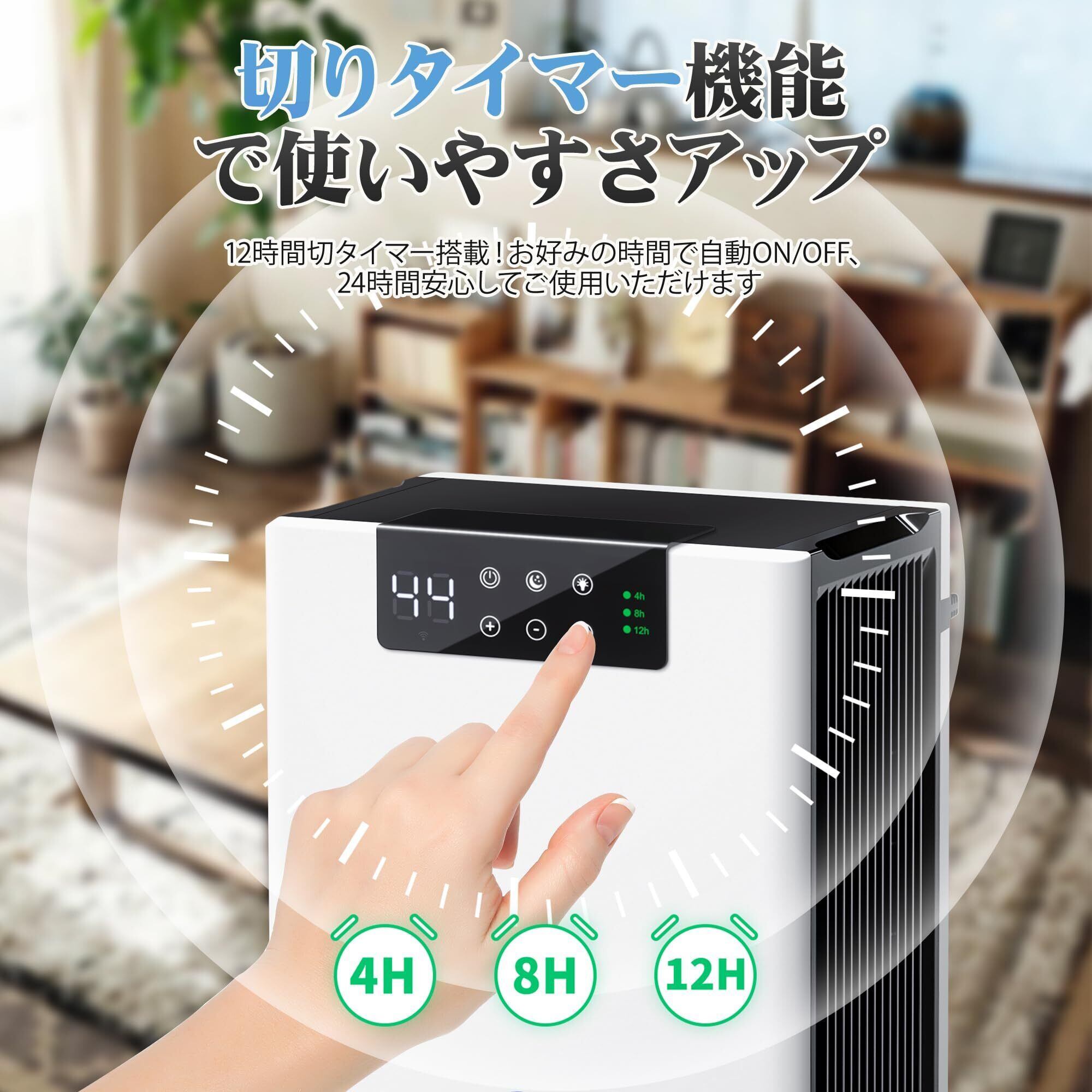 【大容量タンク·スマート機能·自動停止機能付き】大容量タンクを搭載しております(同価格帯平均比150%容量)。自動停止機能とLED水量表示で夜間も管理がラクラクになります。30℃/湿度80%環境下で、750ml/日の除湿能力を発揮できます(※日本工業規格JIS C 9612に準拠)。4/8/12時間の3段階タイマー設定可能で、ちゃんと部屋をじょしつきし、外出時も安心できます。