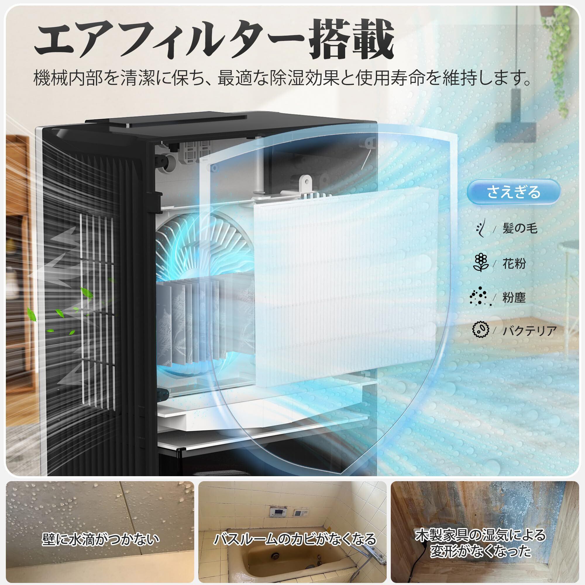 ️【半導体技術·空気清浄ケア機能】最新の半導体技術を採用し、従来比40%の電力削減を実現できます。背面に高性能フィルターを内蔵し、除湿しながらPM2.5やハウスダストを捕捉できる除湿器です。マイナスイオン発生機能で、リラックス空間を創出します。多機能性を持ちながら、より静音性に優れた設計です。
