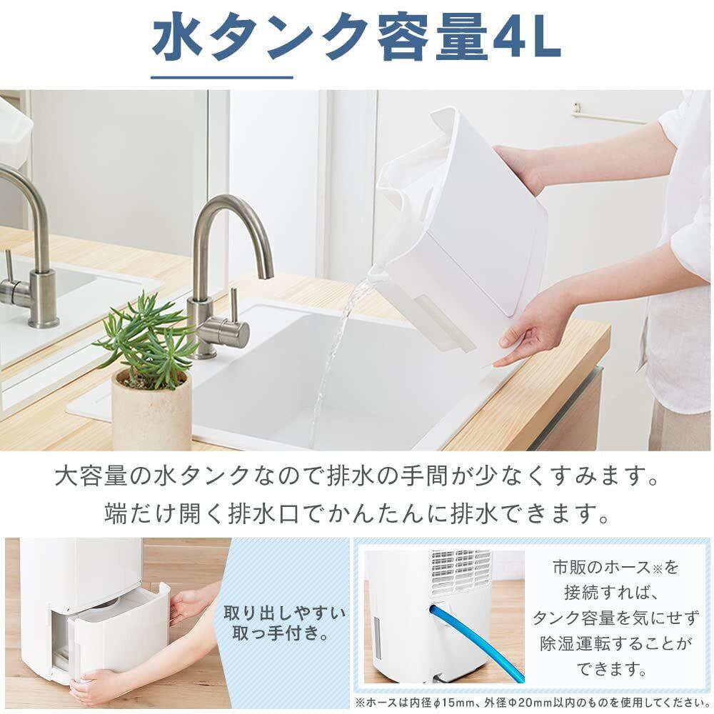 主力にするならこの一台、除湿能力12Lで湿気を解決。コンプレッサー式衣類乾燥除湿機。◆パワフル除湿除湿能力12L/日 ※定格除湿能力は、室温27℃、相対湿度60%を維持し続けた時の1日(24時間)あたりの除湿量です。最大30畳除湿 リビングから寝室までどんなお部屋もしっかり除湿します。 ※除湿可能面積の目安は、JEMA((一社)日本電機工業会)規格に基づいた数値です。水タンク容量4L 大容量の水タンクなので排水の手間が少なくすみます。 端だけ開く排水口でかんたんに排水できます。 取り出しやすい取っ手付きです。連続排水もできる 市販のホース※を接続すれば、タンク容量を気にせず除湿運転することができます。 ※ホースは内径φ15mm、外径φ20mm以内のものを使用してください。◆家計にやさしいコンプレッサー式コンプレッサー式は、空気を冷やして結露を発生させる除湿タイプ。少ない電力でパワフルに除湿できて、電気代がお得。◆除湿の強さ4モード除湿ボタンを押すたびに除湿の強さが切り替わります。おまかせにすると、部屋の湿度が55%より高い場合は除湿し、低い場合は送風運転をします。◆衣類乾燥機能付き衣類乾燥ボタンを押すたびに風の強さが切り替わります。◆ルーバー付き上下ルーバーはスイングボタンで自動で動きます。左右ルーバーは手動で調節することができます。◆便利な機能付きタイマー付き:2・4・6時間後に運転停止環境湿度ランプ:部屋の湿度を5段階で表示内部乾燥機能付き:ファンを回して本体内部を乾燥満水ランプ:水タンクの満水をお知らせチャイルドロック:事故を防ぎます自動霜取り:内部の冷却器の霜を自動で除去◆移動らくらくキャスター付き底にキャスターが付いているので、横方向の移動は持ち上げずに行えます。※横方向以外に動かすときや、毛足の長いカーペットの上、傷付きやすい床の上などを移動するときは、取っ手を持って持ち上げて移動してください。 ご注意(免責)>必ずお読みください ●取扱説明書に記載している注意事項をよくお読みになりご使用ください。●ご使用になる前に、「安全上の注意」をよくお読みのうえ正しくお使いください。●期間:お買い上げ日より間。