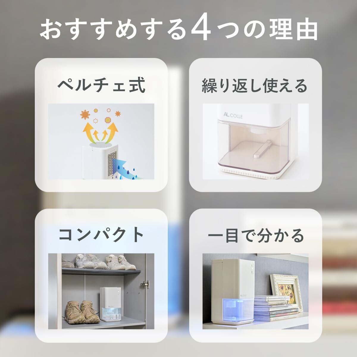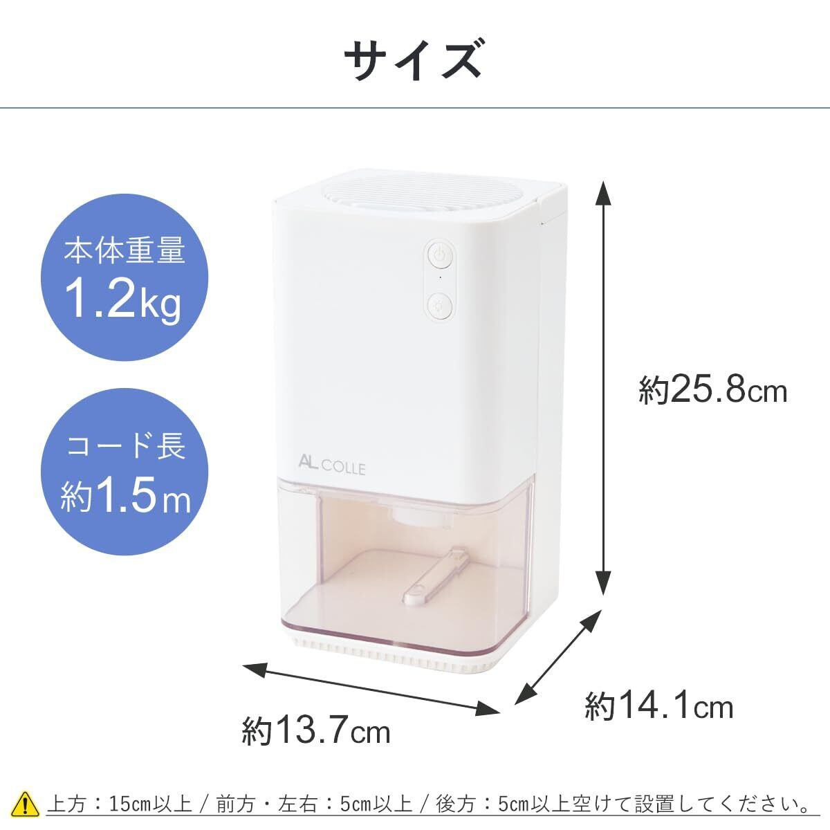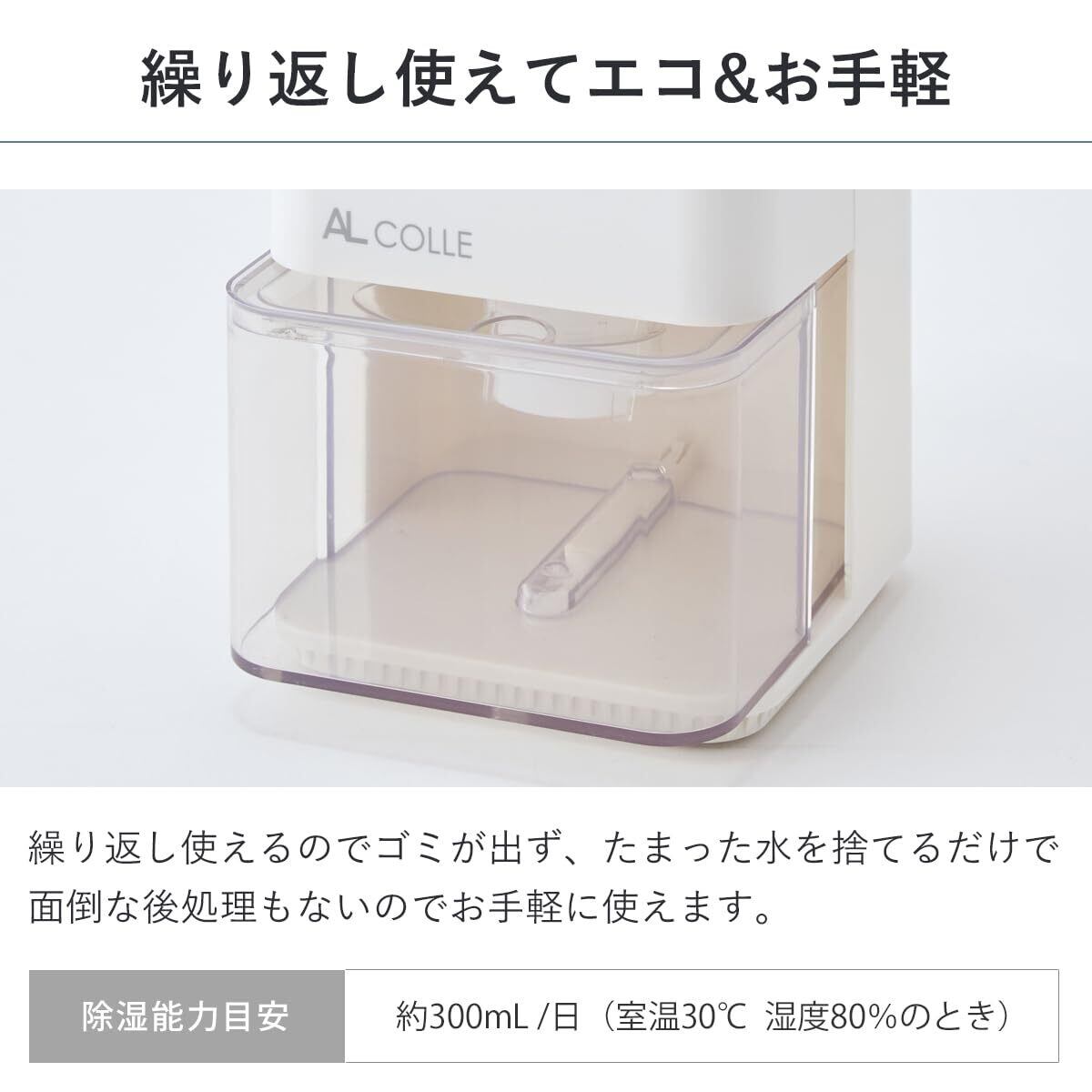 AL COLLE(アルコレ) ミニ除湿機 除湿器 1L 静音 コンパクト 省エネ ペルチェ式 クローゼット 押入れ 靴箱 収納 省スペース くり返し 満水検知 自動停止機能 満水お知らせランプ 取手付 半透明タンク ACアダプター