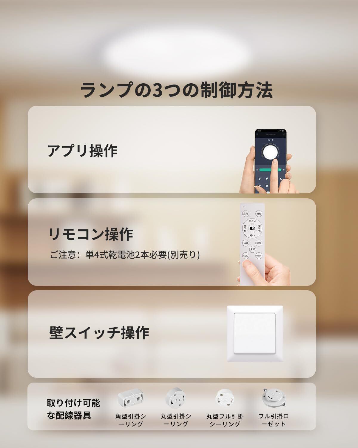 【3つの操作方法に対応】 本製品は、リモコン・スマートフォン・壁スイッチの3つの操作方法に対応し、便利に照明をコントロールできます。アプリでは調光・調色・タイマー設定などを自由に調整可能。LEDライトの使い勝手を最大限に引き出せます。壁スイッチ操作では、素早く切り替えると昼白色 → 昼光色 → 電球色 → 常夜灯の順で切替可能です。