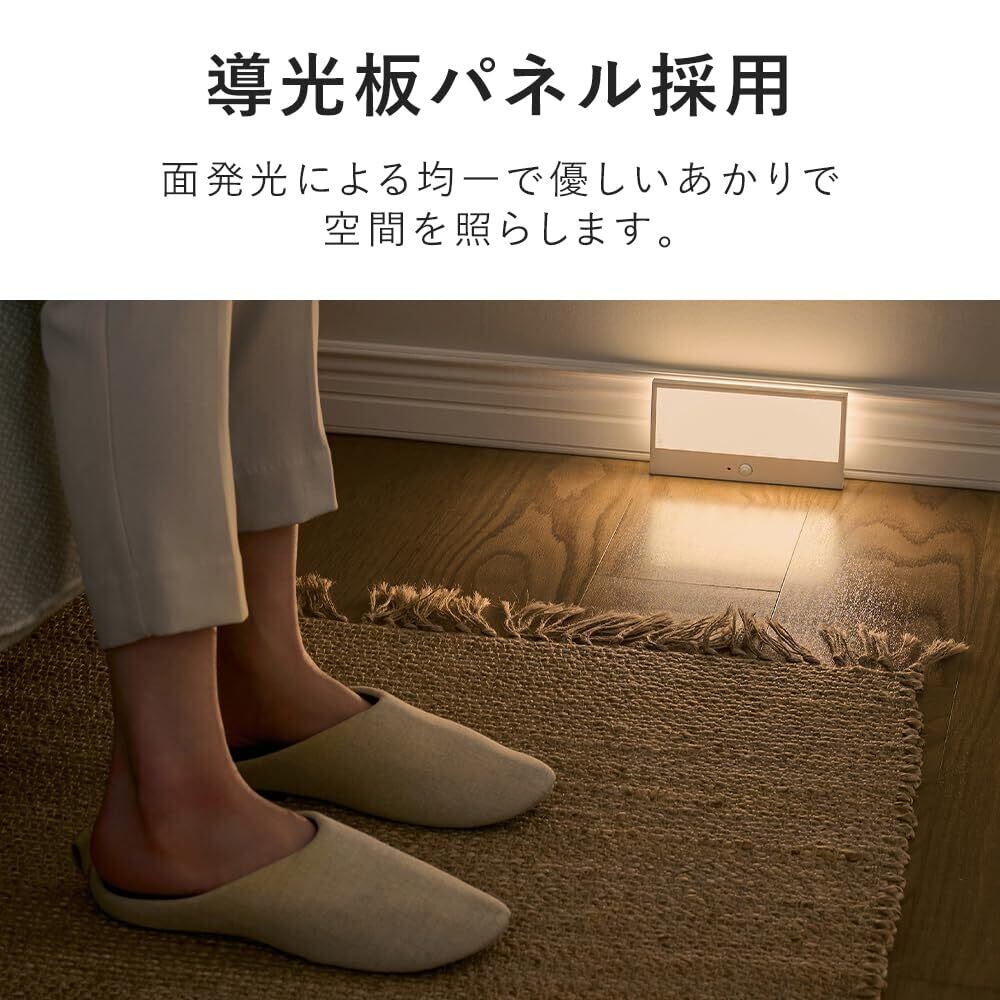 自動で点灯してやさしく照らす。乾電池式LEDセンサーライト[パネルスタンドタイプ:BSL-SMSP]。まぶしさを感じにくく、すぐに使える置き型で壁掛け不可なタイプです。均一でやさしい光“導光板パネル採用”で、眩しさを感じにくいから夜も目覚めにくいです。おすすめ設置場所は、寝室や玄関です。