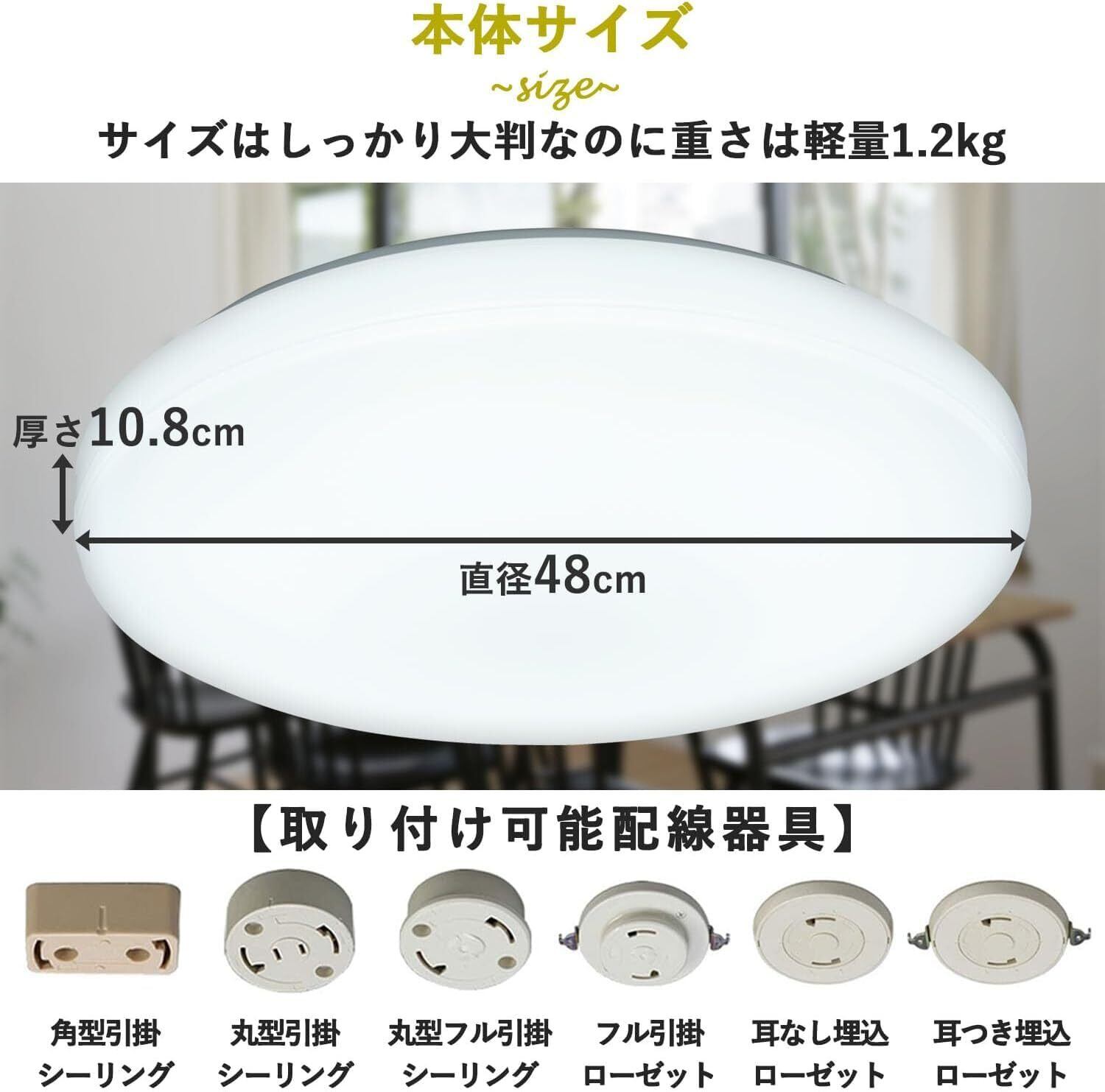 【商品仕様】▪商品サイズ:直径48×高さ10.8cm ▪商品重量:1.25kg ▪消費電力:32W ▪器具光束:3600lm ▪演色性:Ra85以上 ▪モジュール設計寿命:約40000時間※モジュール寿命は、LED が点灯しなくなるか、光束が70%に低下するまでのいずれかの短い時間を推定したもので、製品寿命をするものではありません。 ▪期間:お買い上げ日より間(の範囲については、取扱説明書をご確認ください。(一般家庭用以外(業務用など)に使用された場合の故障及び損傷などは対象外となります))