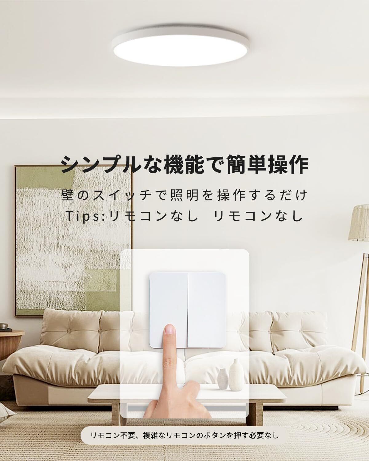 【壁スイッチ操作】 (重要:ご購入前に、ご自宅に壁スイッチがあることをご確認ください) この照明はシンプルなデザインで、操作が非常に簡単です。壁のスイッチだけで照明のオン・オフを操作でき、リモコンは不要で、複雑なリモコンのボタンを押す必要もありません。日常的な使用やライトの調整も簡単に行えるため、生活がより便利で快適になります。 ※本製品にはリモコンは付属しておらず、他のリモコンでの操作は無効です。