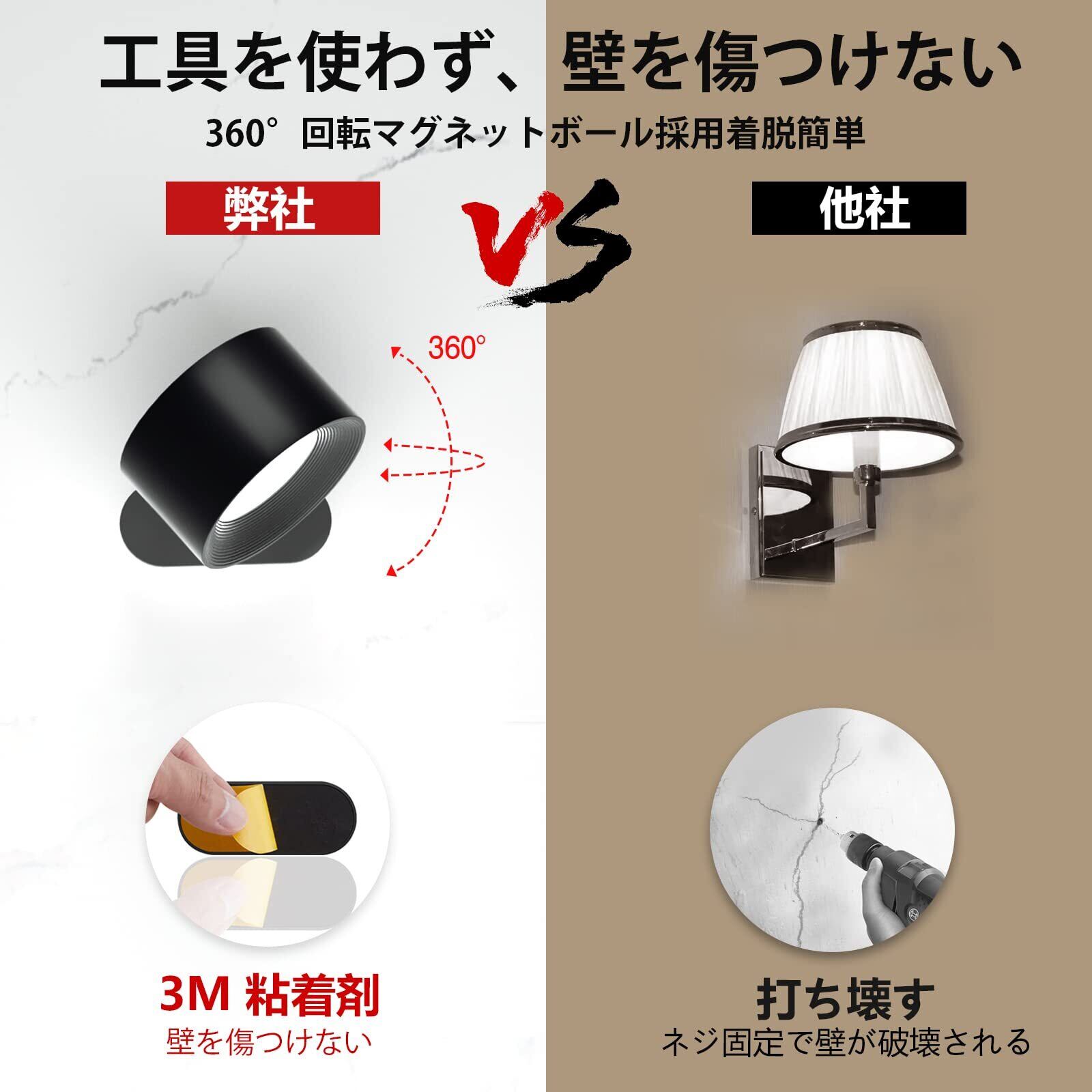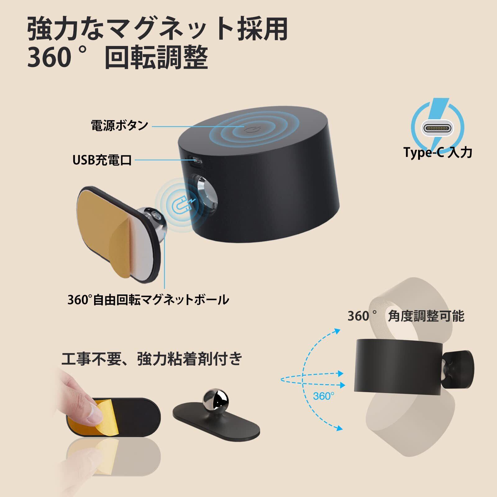 【360°回転調整・工事不要】取得のマグネットヘッドを採用し、360°までご自由に回転させることができます。全方位でお好みの光を提供します。またベースに強力粘着剤を採用し、工事の必要がなく、壁を傷をつけません。1秒だけで、ランプヘッドを取り外すこととインストールすることができます。