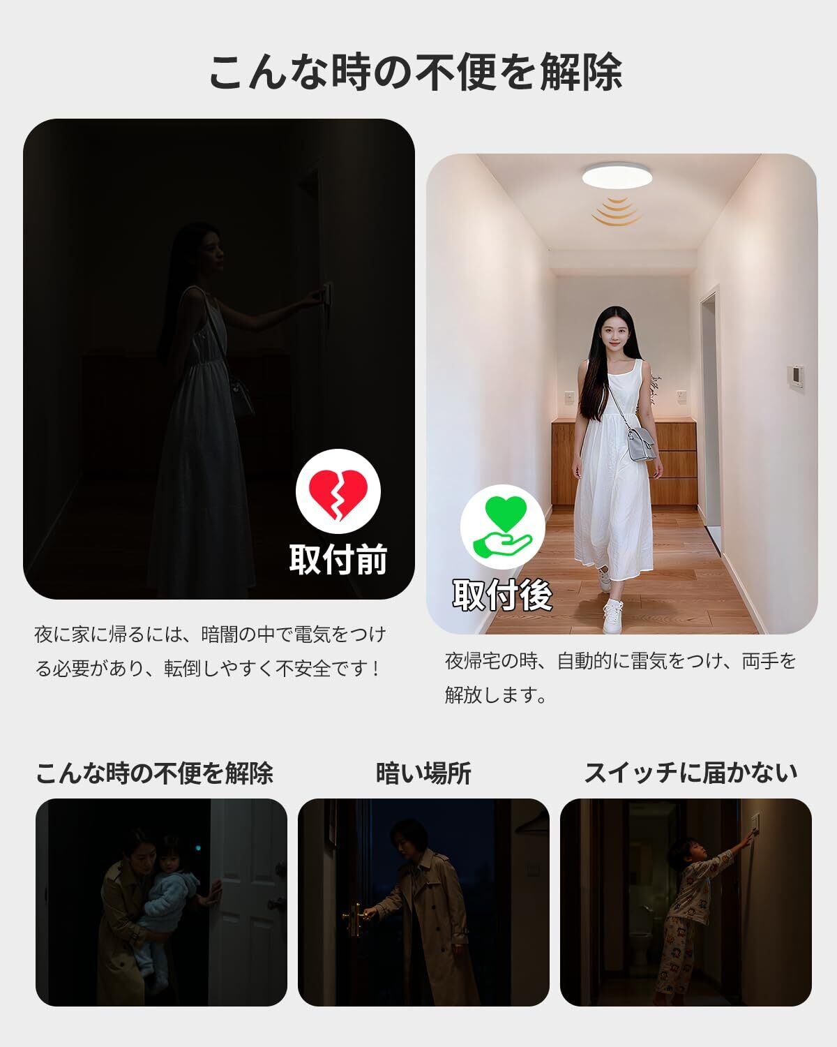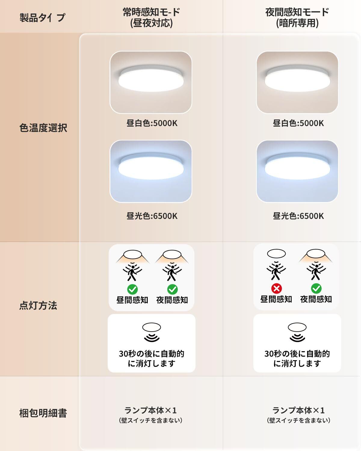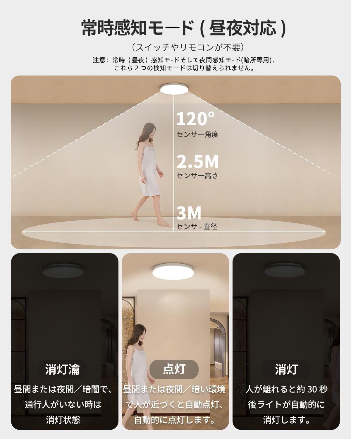 【常時感知モ—ド(昼夜対応)】①昼夜を問わず、自動点灯します。が離れると約30秒後ライトは自動的に消灯します。②センサ一角度:120°/センサ-直径:5M/センサ一高さ:3M。③消灯:昼間または夜間/暗闇で、通行人がいない時は消灯状態。/点灯:昼間または夜間/暗い環境で人が近づくと自動点灯、自動的に点灯します。/消灯:人が離れると約30秒、後ライトが自動的に消灯します。