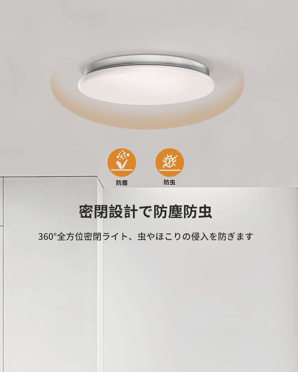【虫よけ、清潔便利】LED光源は虫を寄せ付きにくい波長、本体とカバーの間は密閉されているため、虫は照明器具の中に入ることができません。掃除する必要がないので、シーリングライトがずっと清潔で明るさを保ちます。