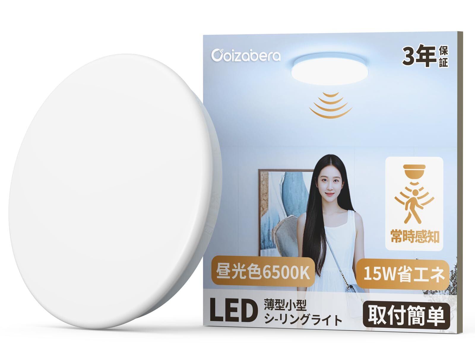【スペック】商品名:LEDシーリングライト / 消費電力:15W / 全光束:2400lm / 定格電圧:AC85V~265V(50/60Hz) / 色温度:昼光色6500K / 演色性:85Ra以上 / 設計寿命:40000時間 / 材質:ABS / サイズ:(約)17CM x 4cm / 重量:約210g / 期間:3年 / スイッチタイプ:常時感知モード(昼夜対応)(スイッチやリモコンが不要)