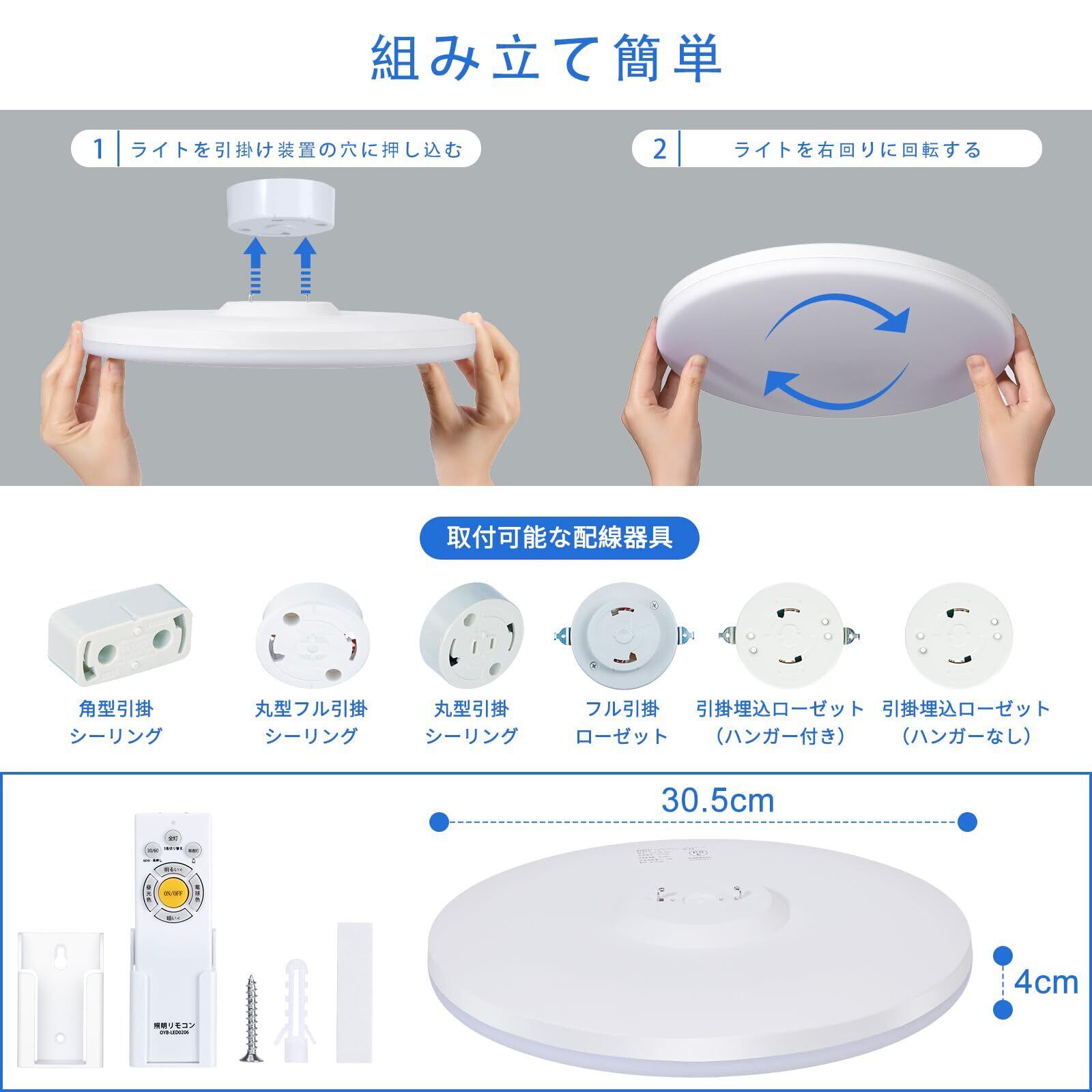 【取り付け簡単】一体化デザイン、複雑なパーツなし。シーリングライトの本体を天井の引っ掛けシーリングに押し込み、時計回りに回して取り付けが完了になります。工具も配線も不要で、素人でも1分足らずで取り付けができます