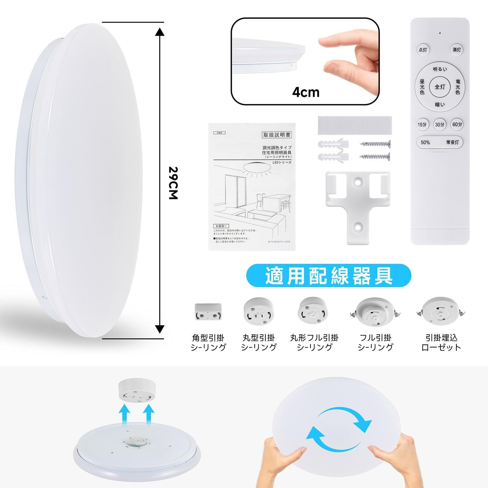 【取り付け簡単】一体化デザイン、複雑なパーツなし。シーリングライトの本体を天井の引っ掛けシーリングに押し込み、時計回りに回して取り付けが完了になります。工具も配線も不要で、素人でも1分足らずで取り付けができます