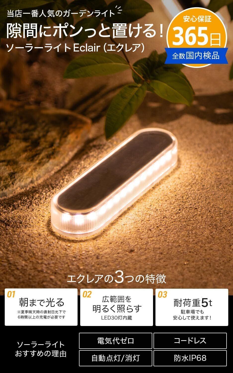 【高性能LED搭載・完全防水仕様】 HAPPYJOINT エクレアは、暖色LED30灯を内蔵した高輝度モデル。IP68等級の完全防水・防塵設計で、雨天時や水気の多い環境でも安心してご使用いただけます。センサーライト 屋外と組み合わせることで、より効果的な夜間照明が実現できます。