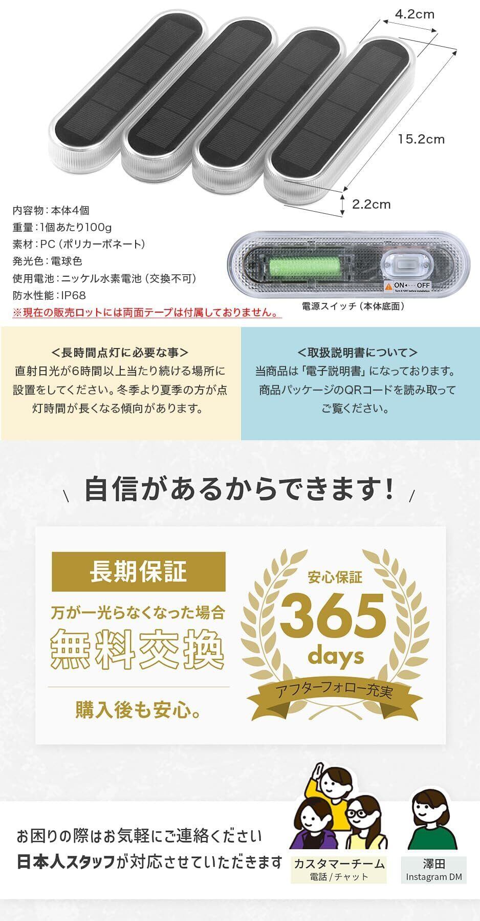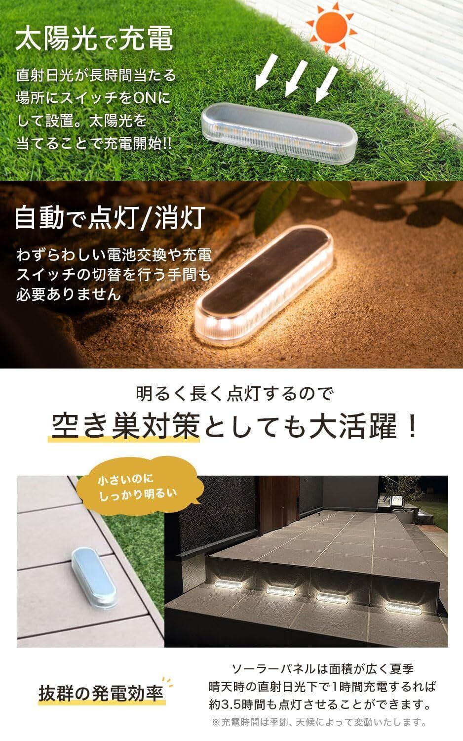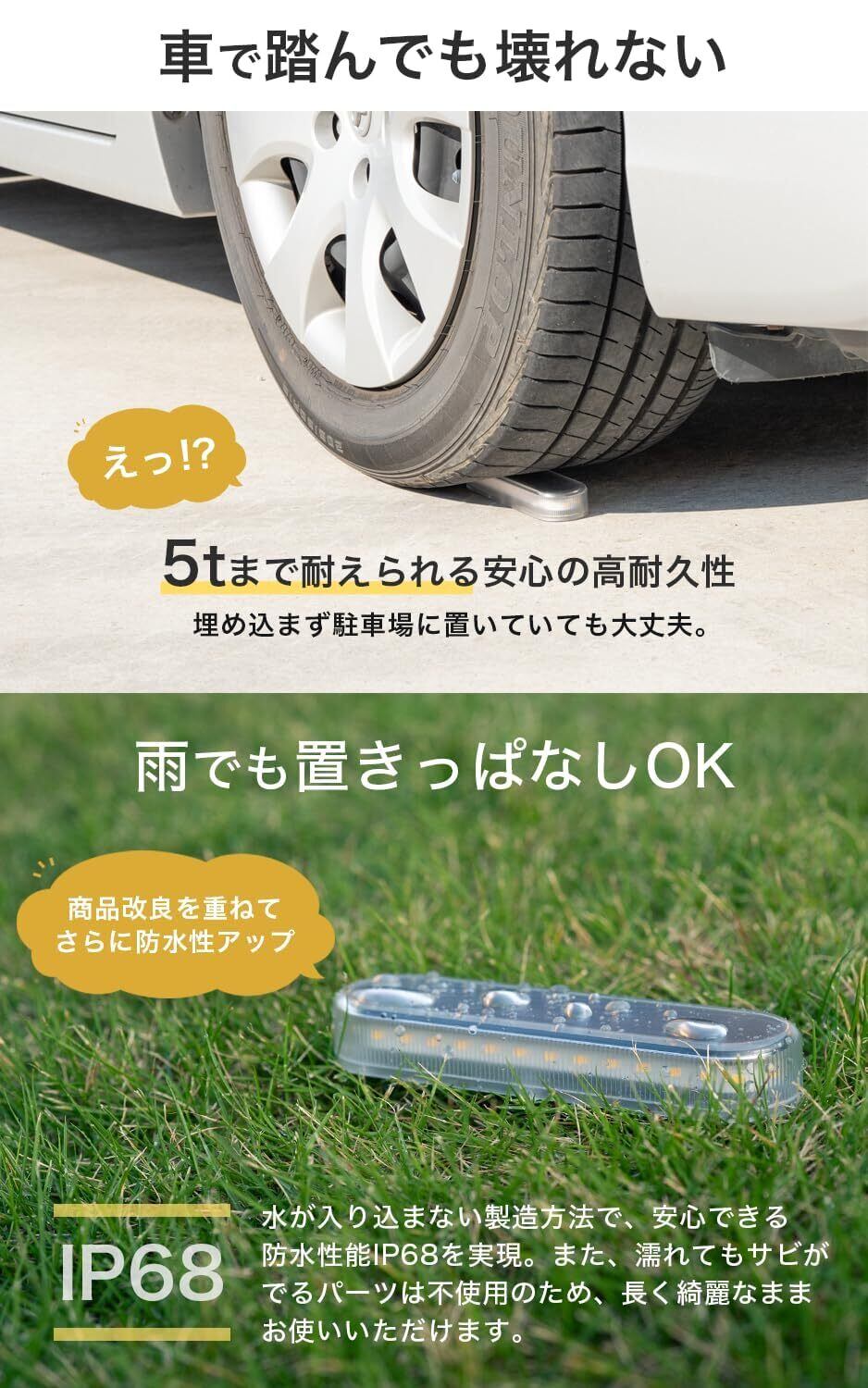 【詳細仕様】 サイズ:幅15.2cm × 奥行き4.2cm × 高さ2.2cm 重量:約100g(軽量コンパクト) LED:暖色30灯内蔵 バッテリー:ニッケル水素電池 防水等級:IP68(完全防水・防塵) 素材:高品質PC樹脂 耐荷重:5t(車両通行可能)