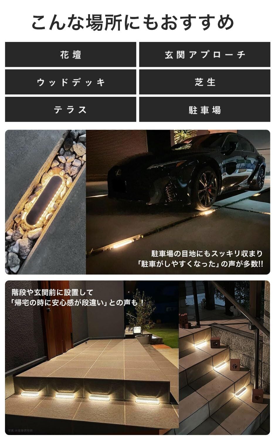 【多彩な設置シーン】 アプローチ・通路:足元を優しく照らす屋外照明として 花壇・植栽周り:景観を損なわない小型デザイン 階段・段差:安全確保の補助灯として フェンス沿い:境界線の視認性向上に カーポート下:車の駐車時、乗降時の補助ライトに