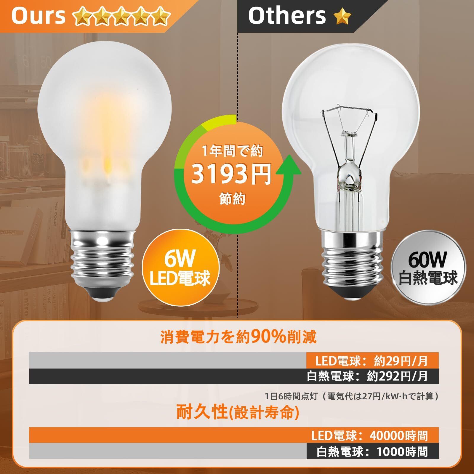 ◎商品仕様:対応口金:E17(口金直径17mm)、定格消費電力:6W(60W形相当)、全光束(明るさ):850lm、電球サイズ:Φ35*68mm(白熱電球と同じサイズ)、定格電圧:100V 50/60Hz共用 、色温度:3000K 電球色相当、配光角:約360°(全方向タイプ)、演色性:Ra≥85、材質:すりガラス。※注意:調光器と調光器具非対応
