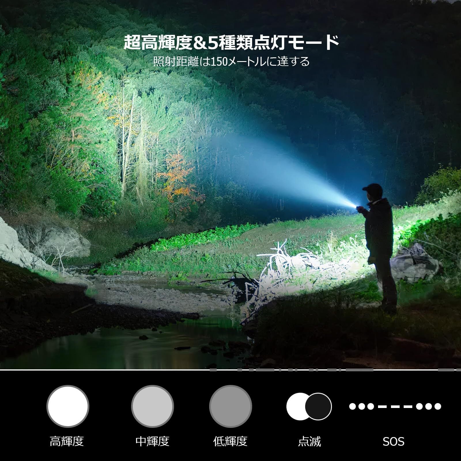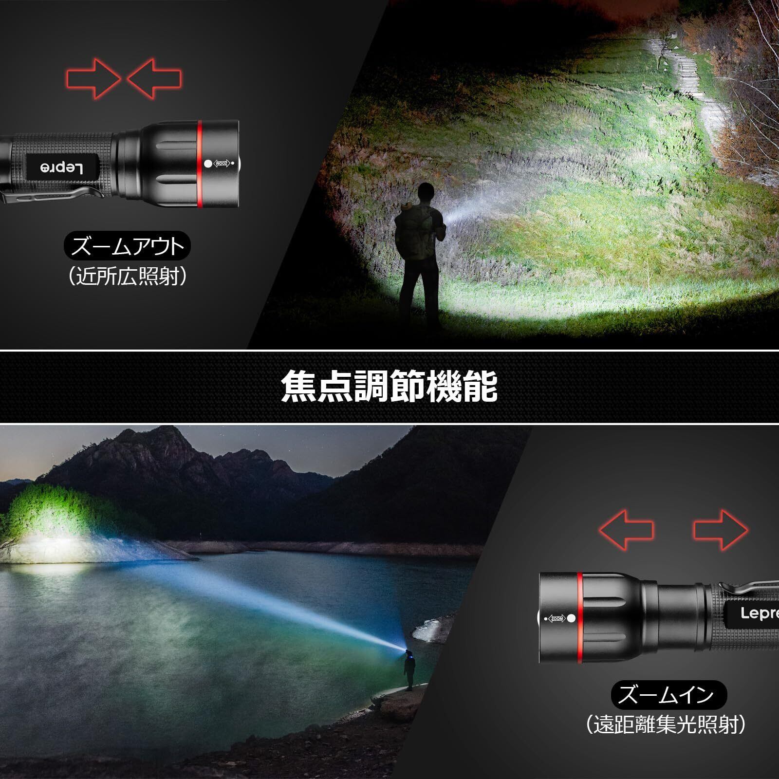 【便利なズーム式・5種類の点灯モード】この懐中電灯には、伸縮式のフォーカスレンズが搭載されており、ヘッド部分を引っ張ることで光の焦点距離や照射範囲を調整することができます。これまで夜間の安全性を気にしていた方におすすめです。さらに、ハイ、ミドル、ロー、フラッシュ、SOSの5つの点灯モードを搭載しています。用途に応じてモードを変えられるので、とても便利です。(スイッチボタンを半押ししてモードが切り替わります。スイッチボタンを全押しして懐中電灯が消灯します。)