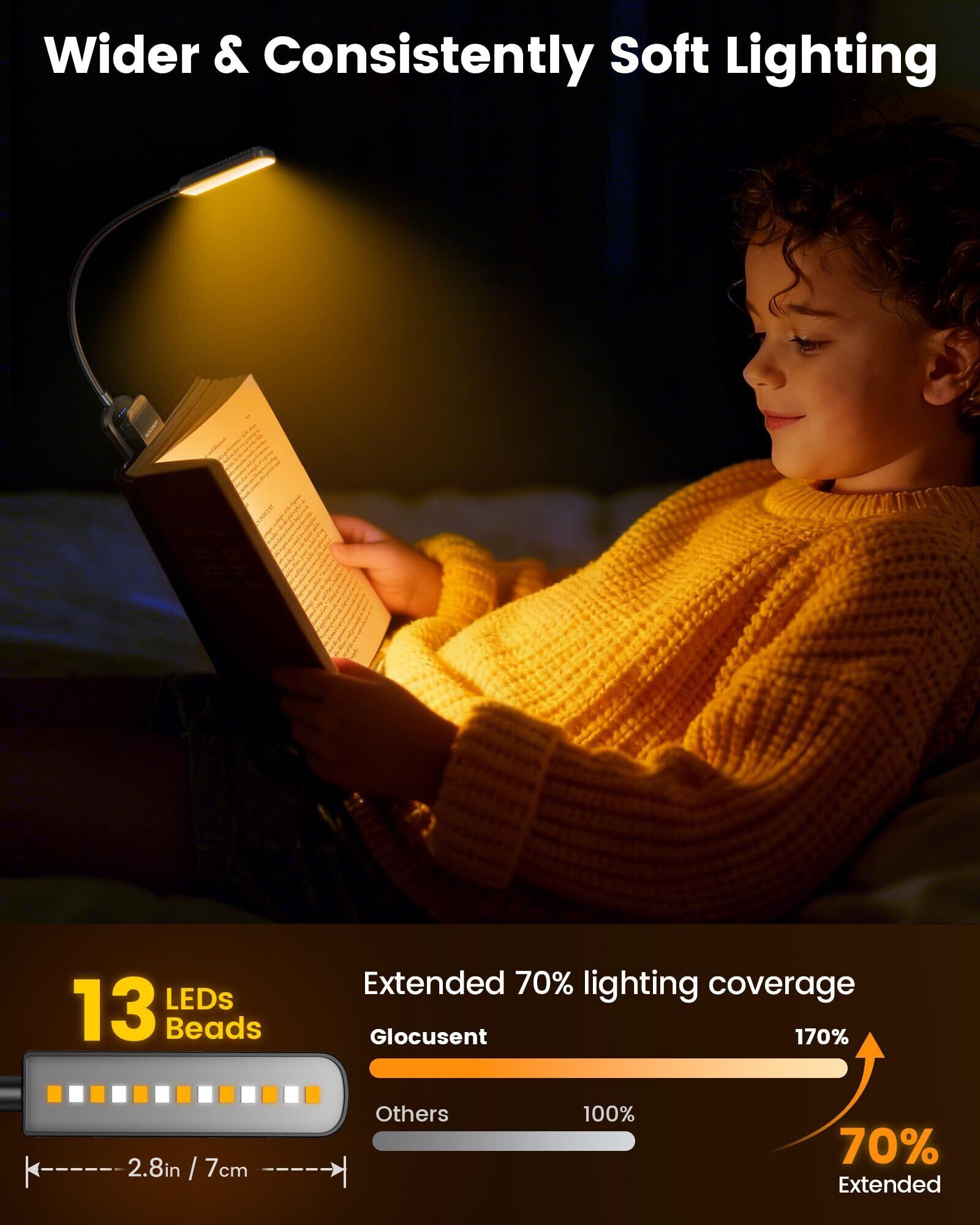 Glocusent 読書灯 13LED ブックライト 120時間連続使用可能 充電式 読書用ライト 3色温×無段階調光(3〜60LM) 目に優しい クリップ式 ライト ベッド読書・子供読書に最適