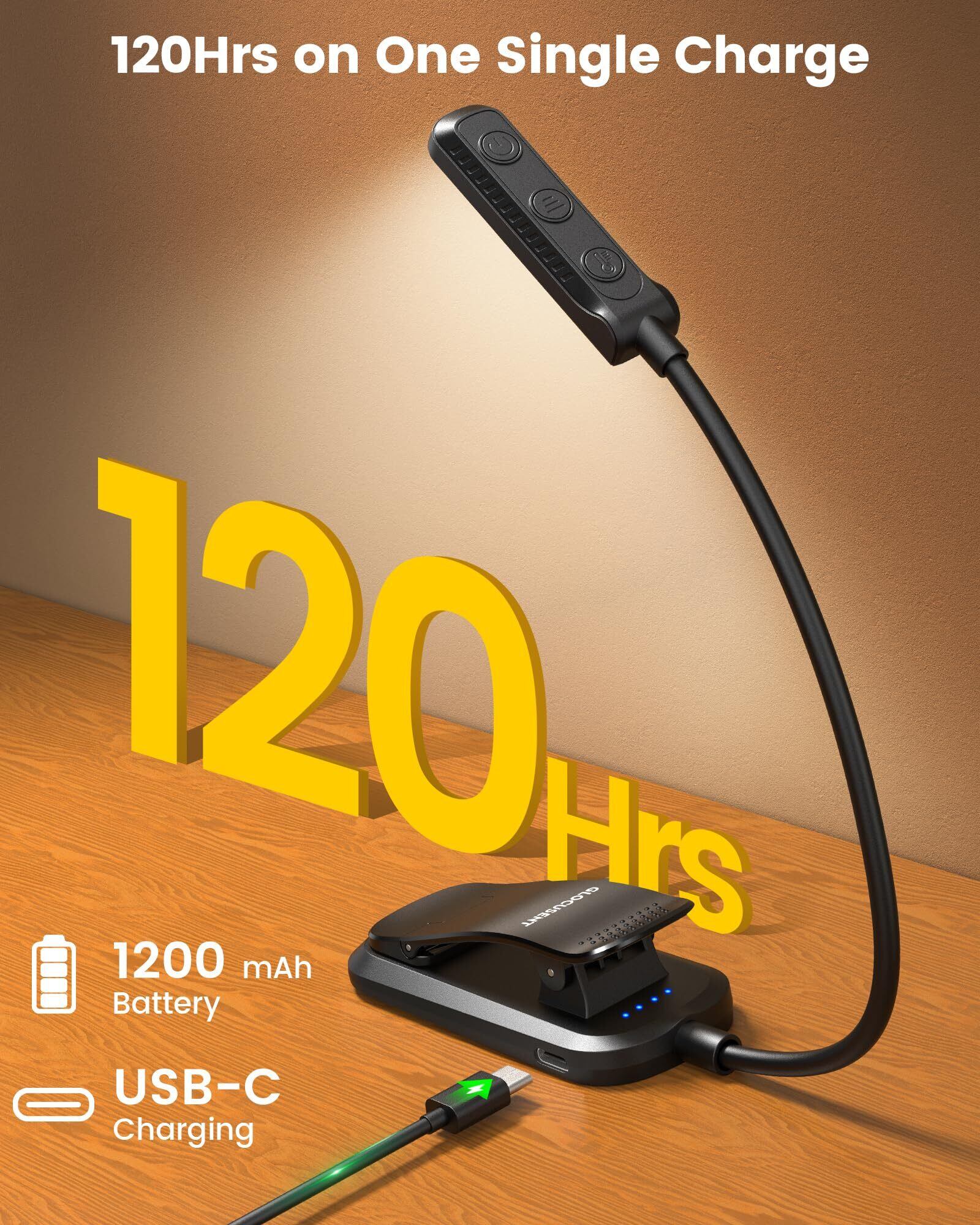 【最長120時間のバッテリー&USB-C充電】1200mAhの充電式バッテリーを搭載し、1回の充電で最長120時間使える超ロングバッテリーの読書ライトです。毎日30分の読書なら、なんと約8か月も充電不要。ベッド ライトとして夜間の読書を長くサポートします。便利なUSB-C充電に対応し、さらに4段階のバッテリーインジケーターで残量がひと目で確認できるため、外出先でも安心。長時間読書に最適なブックライトを求める方にぴったりです。