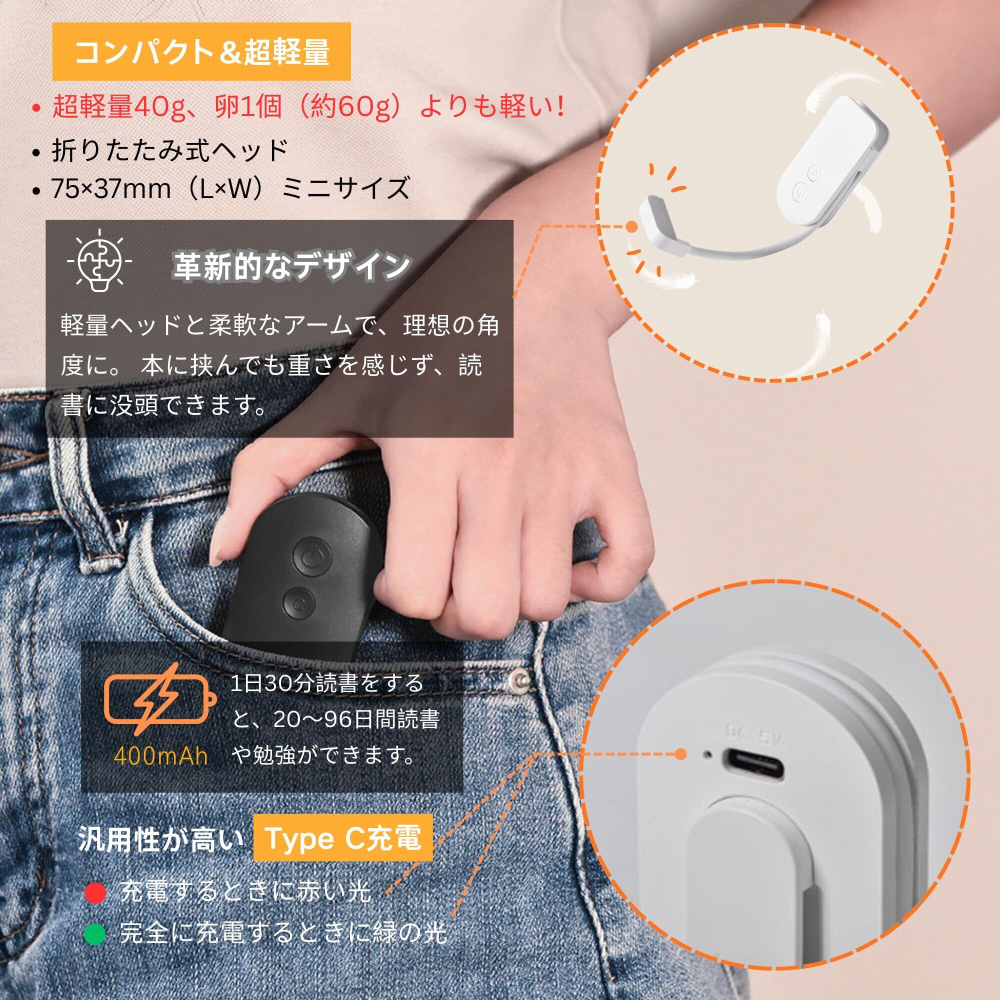 【超軽量40g|持ち運びに便利なコンパクトサイズ】 本体の重さはわずか40g。文庫本一冊分より遥かに軽く、長時間挟んでも本が重く感じません。アームを折りたためば、わずか75×37mmの超コンパクトサイズに。旅行や出張のバッグ、またはポケットに入れてもかさばりません。自宅での寝室用としてはもちろん、機内や新幹線の移動中、出張先のホテルなど、どこでも快適な読書環境を持ち運べます。