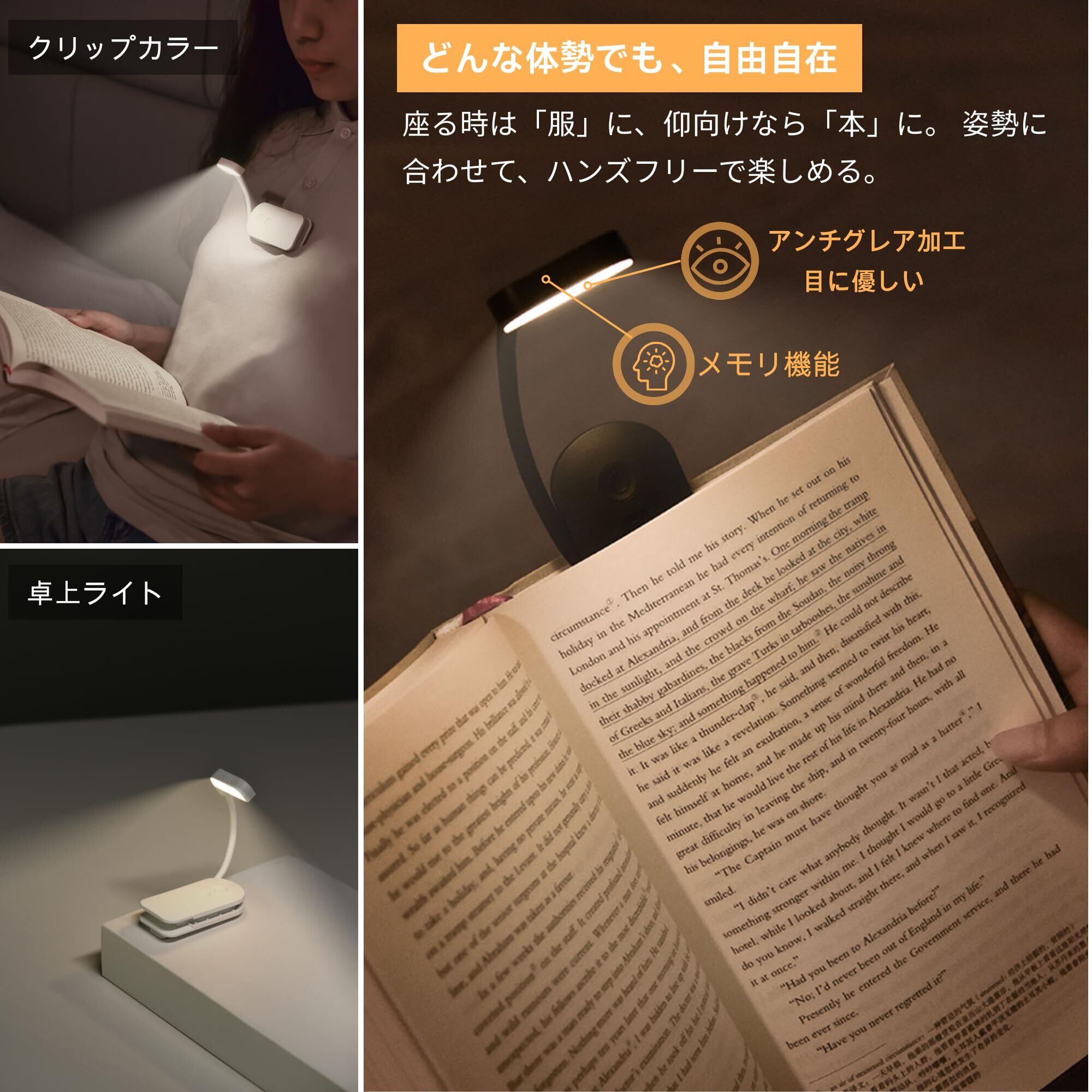 【角度自由自在|フレキシブルアーム設計】 11cmの柔軟なフレキシブルアームを採用した、本につけるライト。光の向きを自由自在に調整できるため、本の隅々まで的確に照らします。クリップ式で本に直接固定できるので、寝ながらの読書や、お子様への読み聞かせにも最適。隣で寝ている家族の邪魔をしない「自分だけの読書空間」を作り出します。従来のかさばる読書ライトとは異なり、座っても横になっても、読書に没頭できるストレスフリーな設計です。