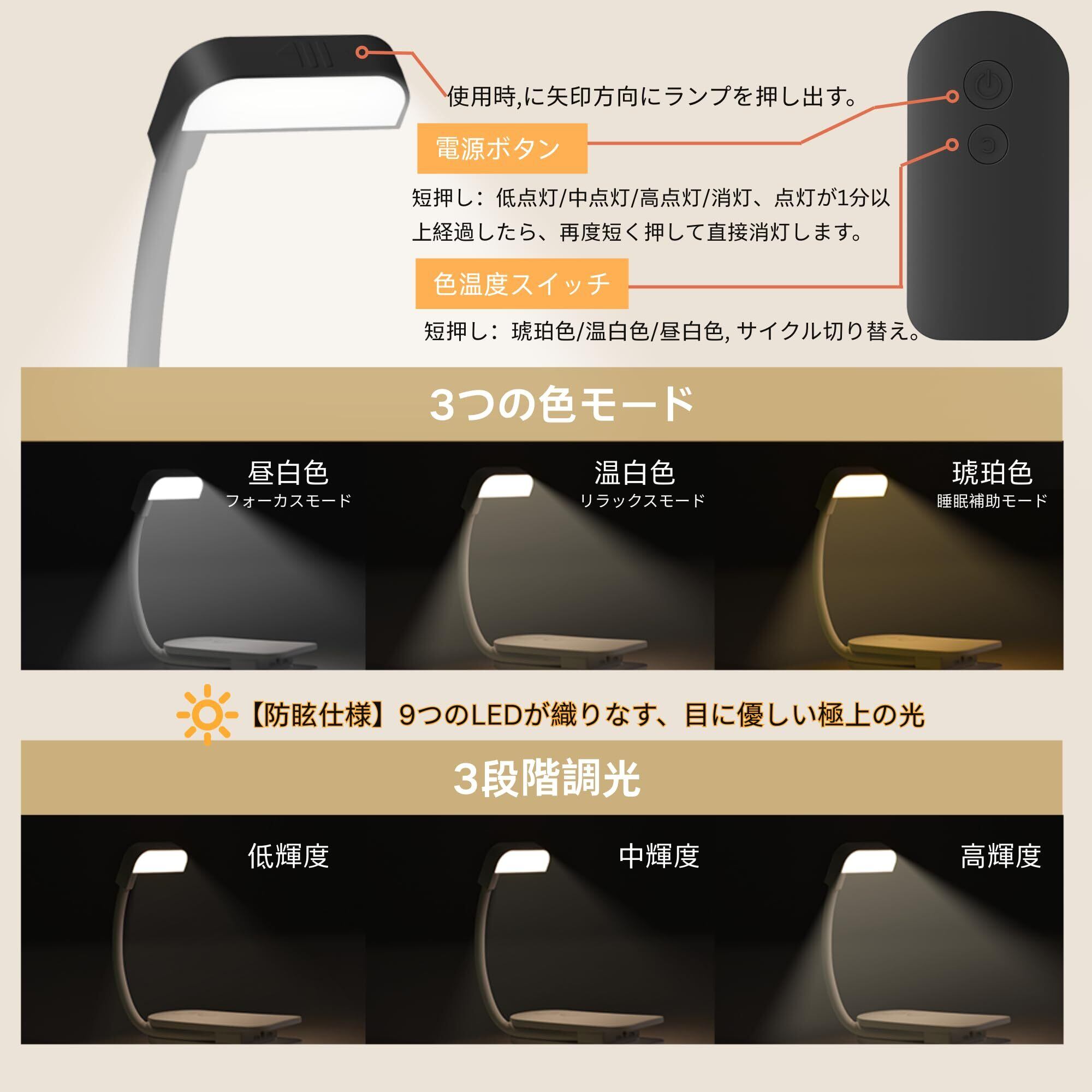 読書灯 ブックライト 目に優しい クリップ式 LEDライト USB-C充電 3段階調色 360°回転 フレキシブルアーム 持ち運び便利 寝室 勉強 手元灯 停電 防災 (ブラック)