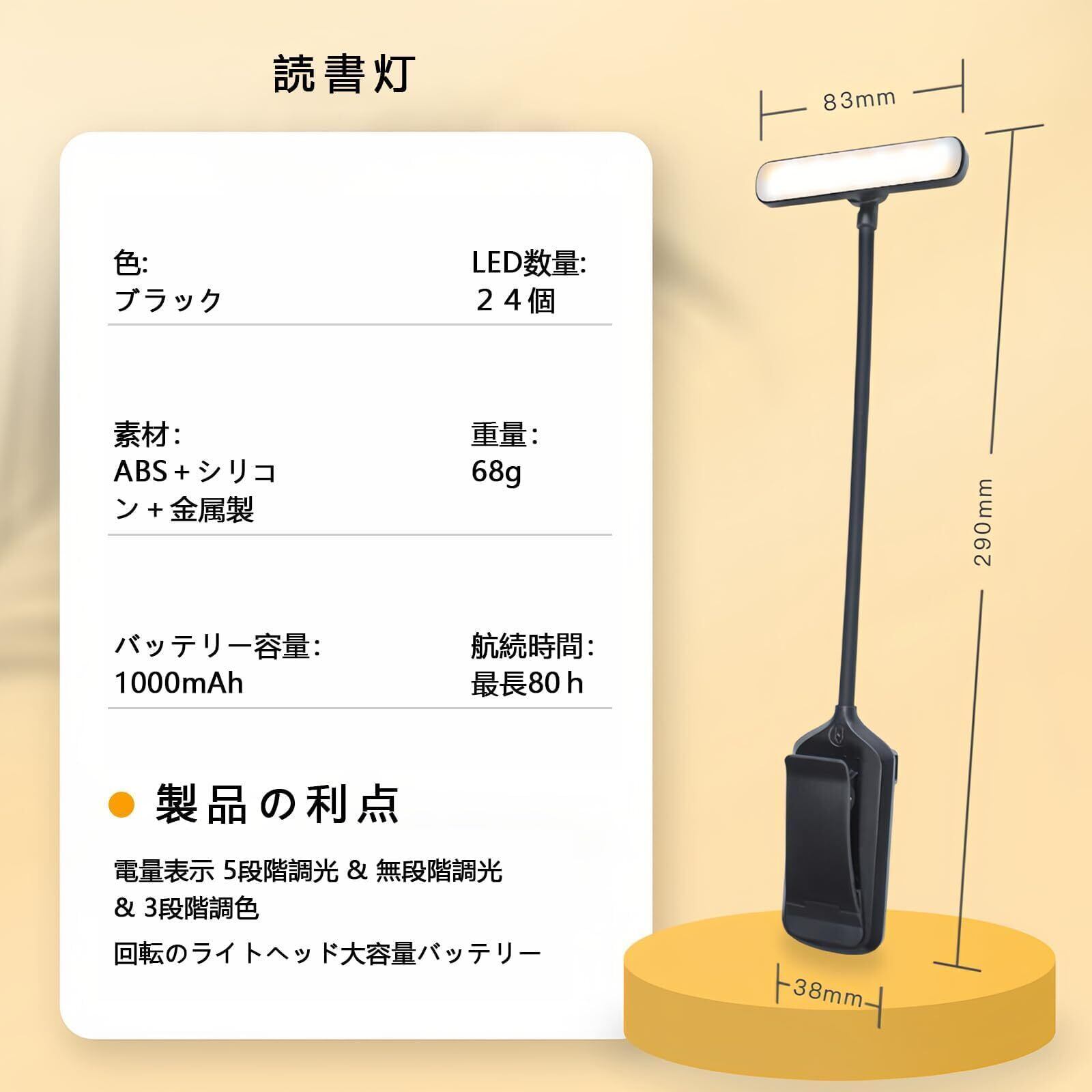 【商品仕様】サイズ:8.3*3.8*2.9cm。色:ブラック。素材:ABS+シリコン+金属製。重量:約68gパッケージの内容:本体、Type-C充電ケーブル、日本語説明書。読書ライトは使用中に何か問題がありましたら、いつでも連絡してください。私たちはご問題を解決するために努力します。