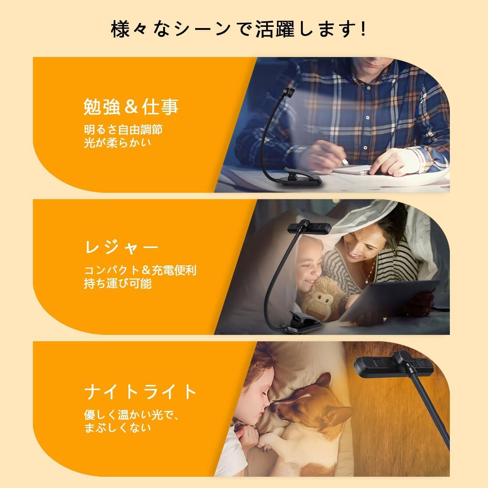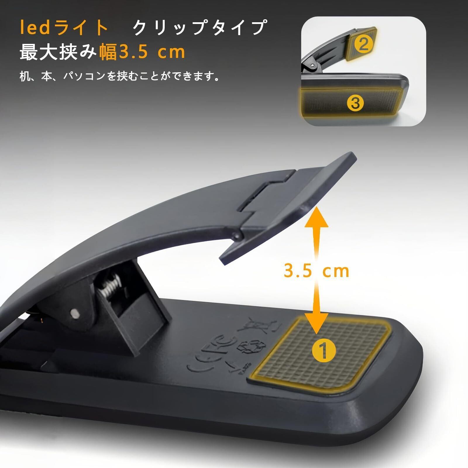 【多用途】コンパクトで軽量なデザインです。読書、勉強、仕事、哺乳などのシーンで活用します。寝室・オフィス・旅行先でも、理想の照明環境を実現します。学生、先生、サラリーマン、授乳中のお母さんなどの夜の利用にぴったりです。クリップタイプで本、卓上、パソコンに挟むことができます。最大挟み幅4 cmです。汎用性が高いです。