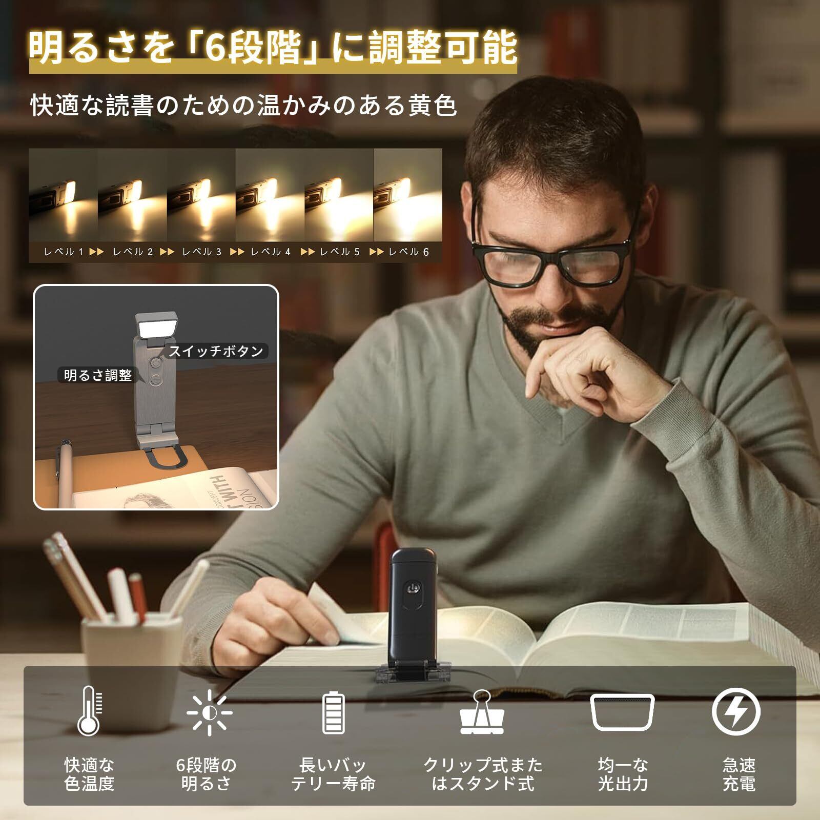 【6段階の明るさ調節可能・目の保護】読書ライトは6段階の明るさが選べて、目を保護する効果があります。自分の明るさのニーズに応じて読書に適した明るさを調整し、集中力を高め、周囲の環境を邪魔することなく快適な読書体験を提供します。