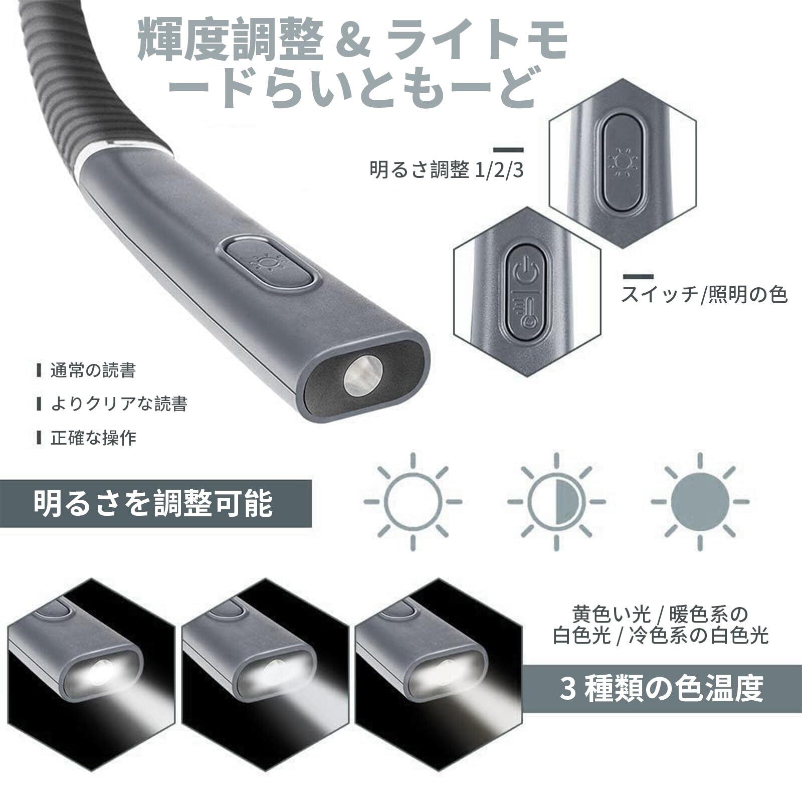ネックライト 読書灯 首掛けライト ベッドでの読書用 充電式 3色 明るさ調節可能 釣り 散歩用 作業 キャンプ 勉強グッズ ベッドサイド 首掛け懐中電灯 看護 夜勤 LED 充電式 停電防災用