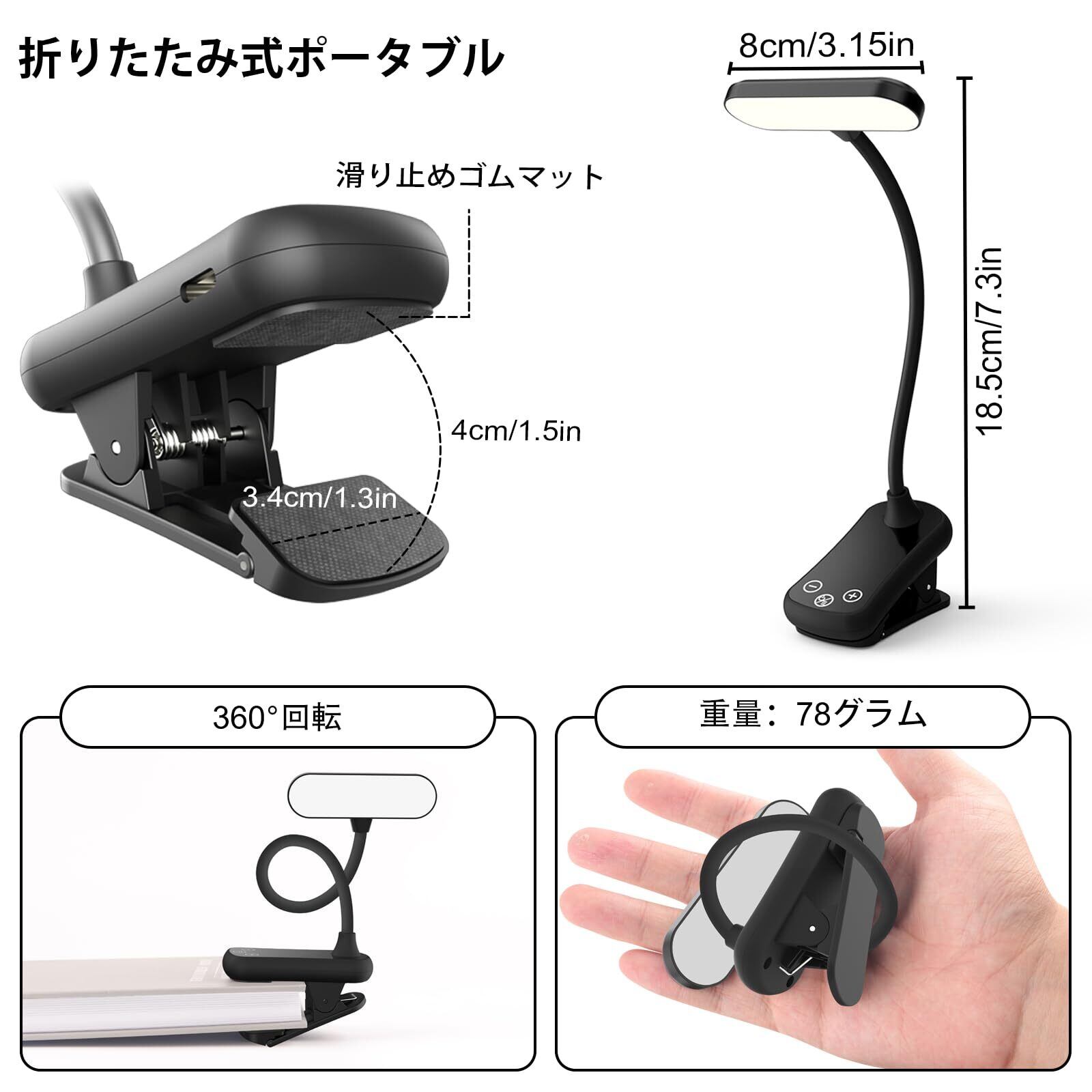 【安定性と携帯性】:読書灯の調節可能なクリップは最大1.5インチ(4cm)まで開き、書籍・デスク・ベッドサイド・ノートパソコンなど様々な物にしっかり固定可能。クリップ内側には滑り止めソフトパッドを配置し、強力な保持力を提供すると同時に、貴重な書籍や机面を傷つけたり挟み込んだりするのを防ぎ、細部まで配慮した保護を実現。直接机の上に置くことも可能です。約100gの軽量設計で携帯性に優れ、旅行や移動中の読書に最適な相棒です。