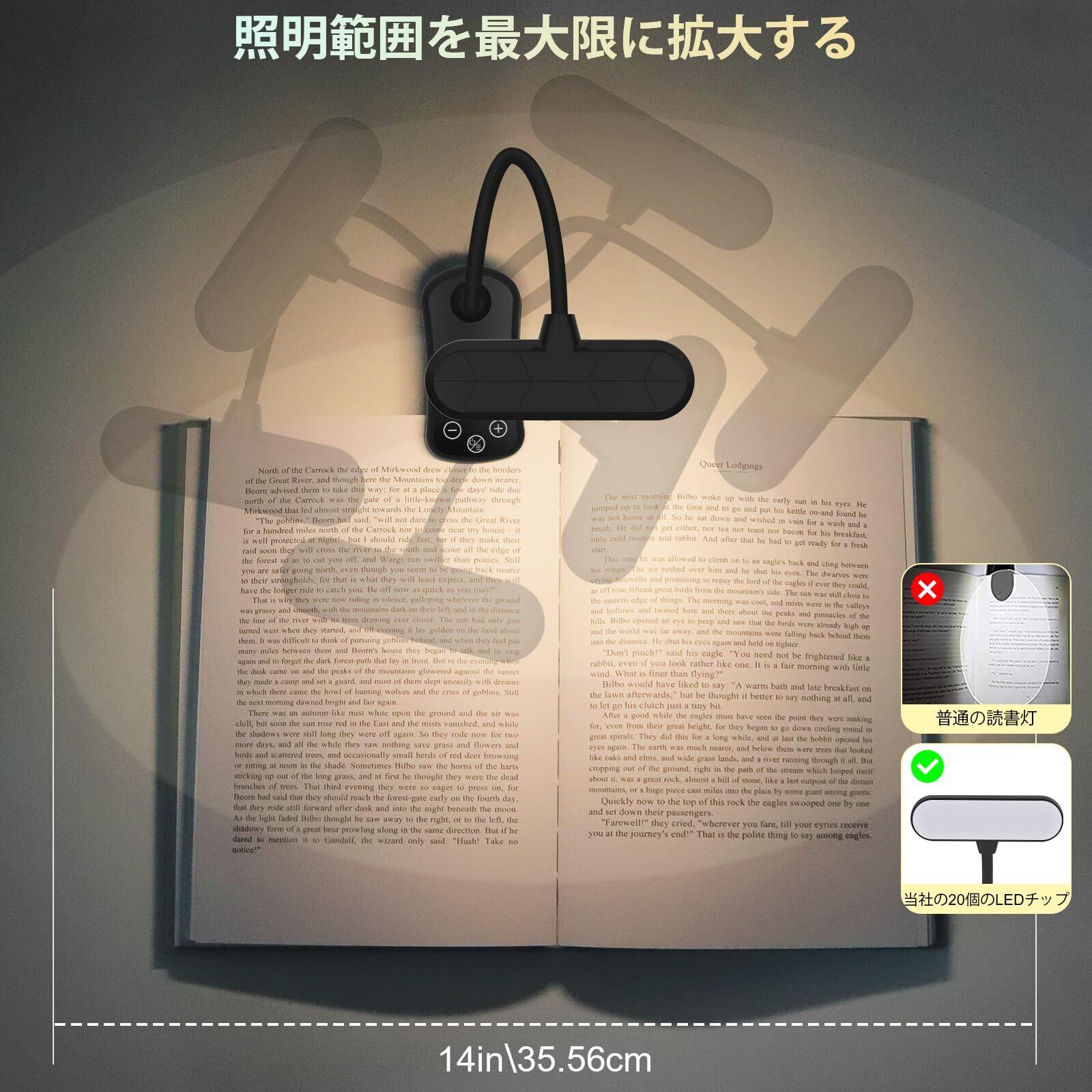 【目に優しいLED読書灯】:ELectight読書灯は20個の高品質LEDチップを採用。柔らかな光はちらつきや眩しさなく、目の負担を軽減。読書、仕事、学習、裁縫、就寝など様々なシーンに適しています。横方向の照明設計により、水平に拡散する光がページ全体を均一に照らし、読みやすさを確保しながら周囲の環境を妨げません。